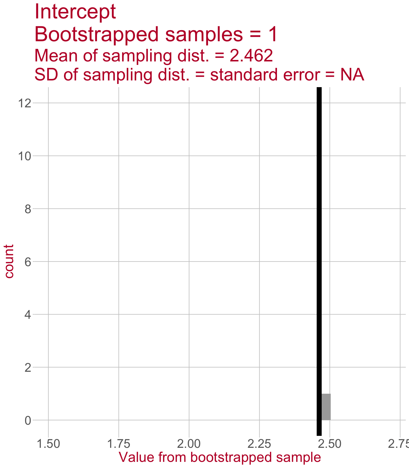 Do 1 and 2 again and again. We’ll get a sampling distribution of intercept estimates and a sampling distribution of slope estimates.