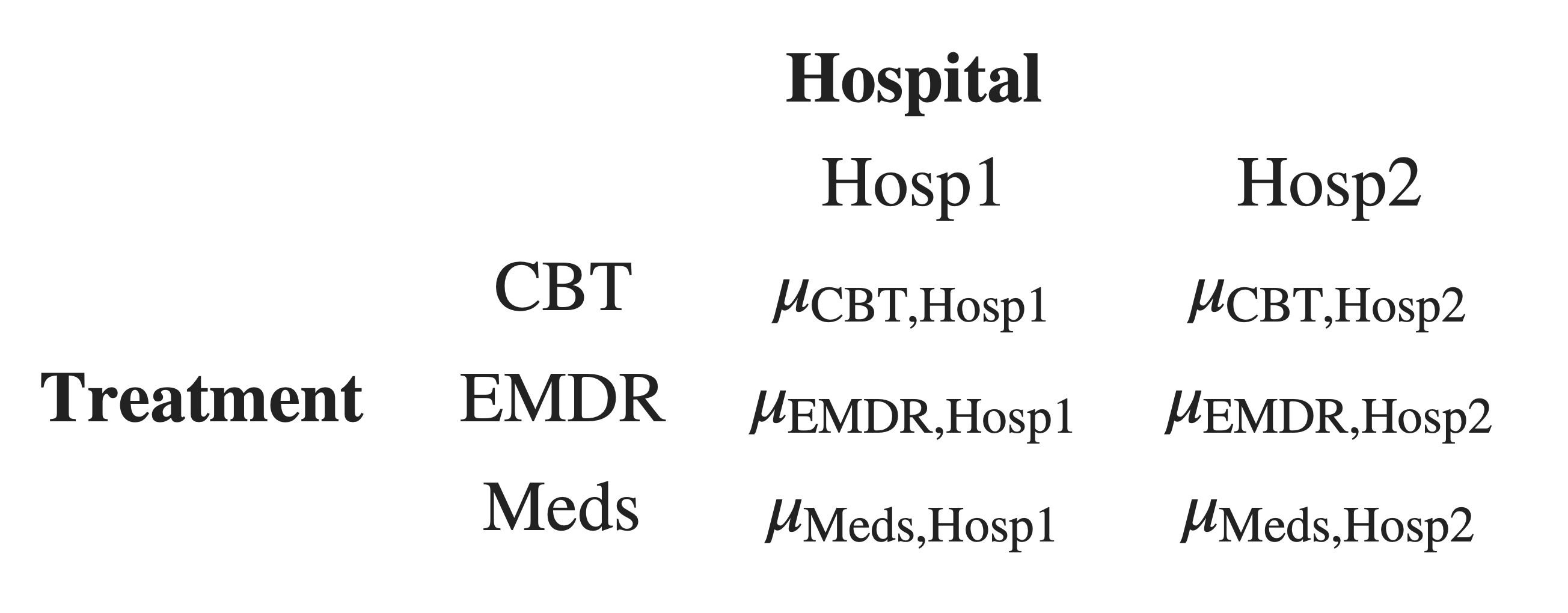 \[\begin{align} H_0 &: \frac{ \mu_{\text{CBT,Hosp1}} + \mu_{\text{EMDR,Hosp1}} }{2} - \mu_{\text{Meds,Hosp1}} = \frac{ \mu_{\text{CBT,Hosp2}} + \mu_{\text{EMDR,Hosp2}} }{2} - \mu_{\text{Meds,Hosp2}} \\ H_1 &: \frac{ \mu_{\text{CBT,Hosp1}} + \mu_{\text{EMDR,Hosp1}} }{2} - \mu_{\text{Meds,Hosp1}} \neq \frac{ \mu_{\text{CBT,Hosp2}} + \mu_{\text{EMDR,Hosp2}} }{2} - \mu_{\text{Meds,Hosp2}} \end{align}\]