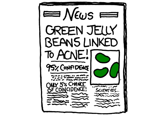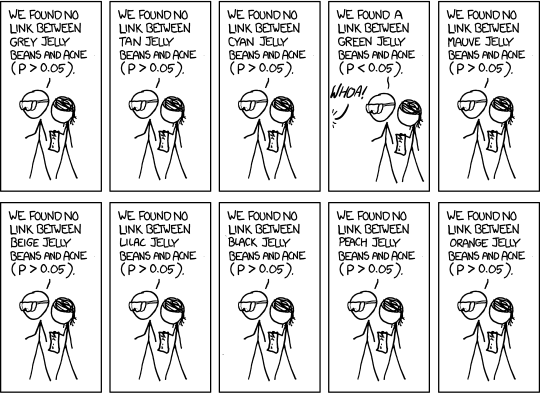 And if we accept that positive result and ignore all the negative results (green jelly bean style), then we run into the multiple comparisons problem: we are more than 5% likely to see at least one false positive, the more tests (aka, the more comparisons) we run.