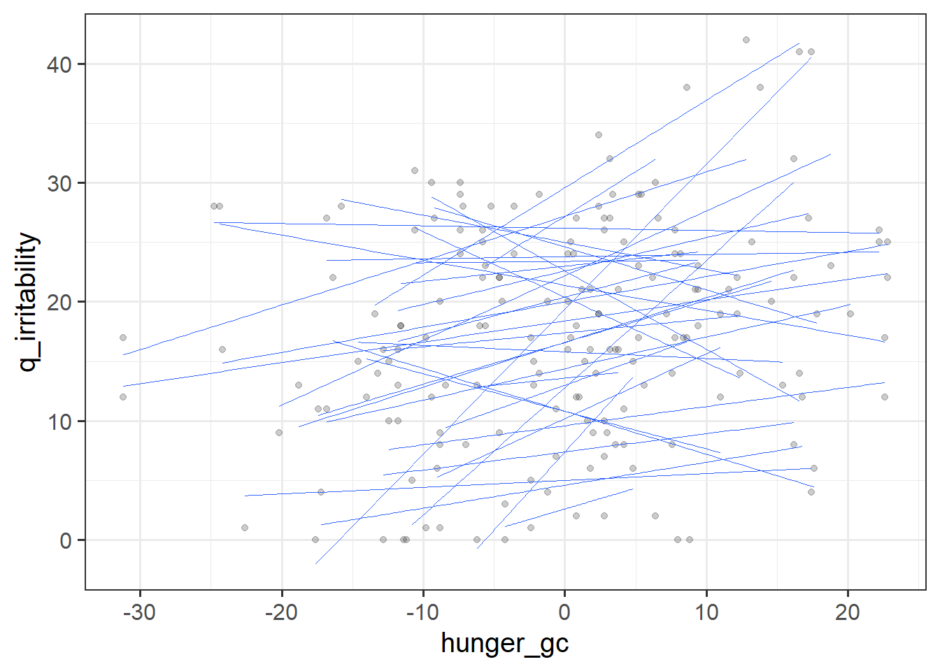 We have taken the raw hunger scores and separated them into two parts (raw hunger scores = participants’ average hunger score + observation level deviations from those averages), that represent two different aspects of the relationship between hunger and irritability.