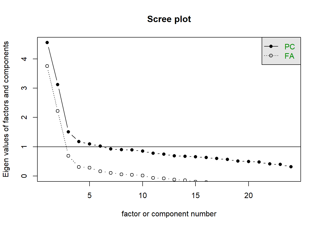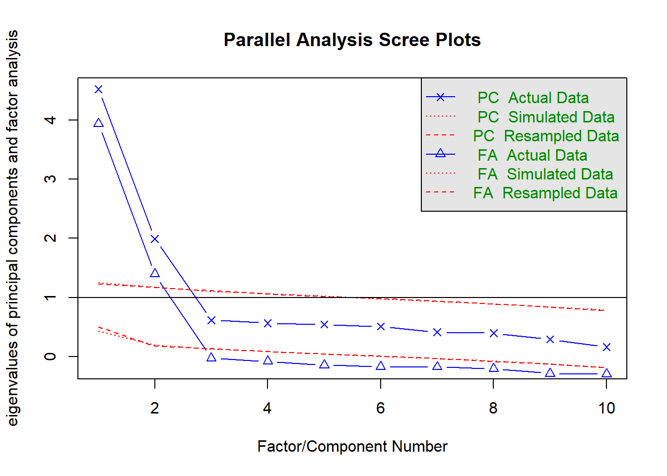 This question can be answered in the same way as we did for PCA - use a scree plot, parallel analysis, and MAP test to guide you.