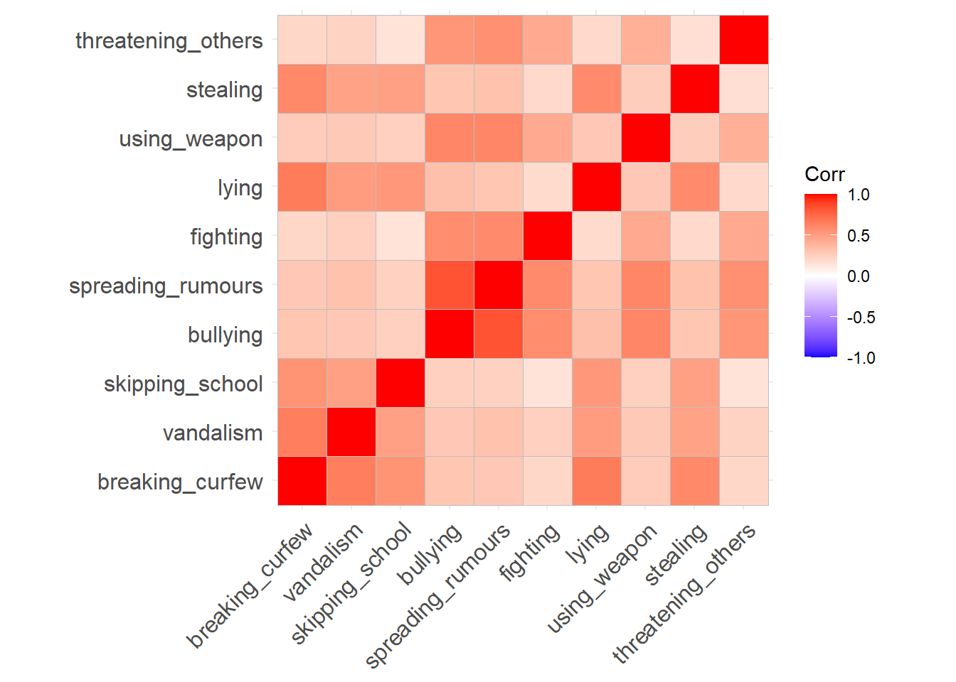 A researcher is developing a new brief measure of Conduct Problems. She has collected data from n=450 adolescents on 10 items, which cover the following behaviours: