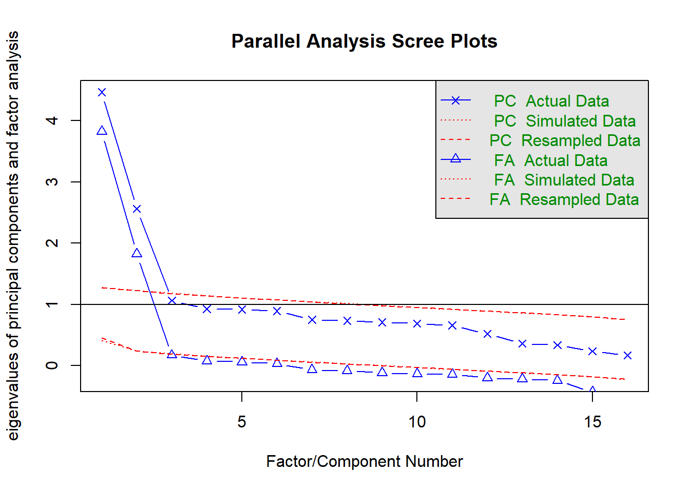 Read in the data, check the suitability for conducting factor analysis, and then examine what underlying dimensions best explain the observed relationships between the 16 mood-related questions in the survey.