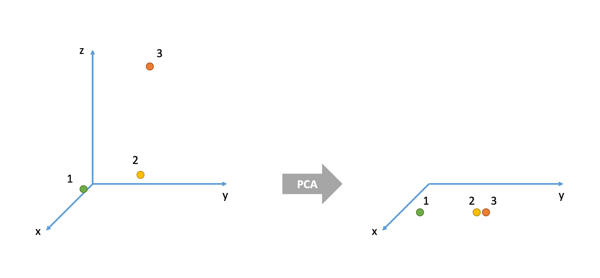 Consider the 3D example below. There are three cases (= units or individuals). In the original space they are all very different from each other. For example, cases 1 and 2 are very different in their x and y values, but very similar in their z value. Cases 2 and 3 are very similar in their x and y values but very different in their z value. Cases 1 and 3 have very different values for all three variables x, y, and z.