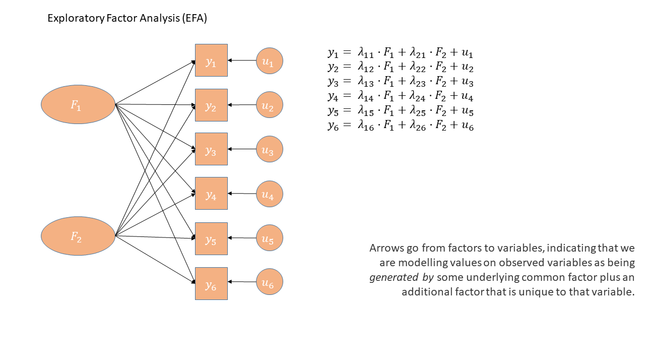 Exploratory Factor Analysis as a diagram has arrows going from the factors to the observed variables. Unlike PCA, we also have ‘uniqueness’ factors for each variable, representing the various stray causes that are specific to each variable. Sometimes, these uniqueness are represented by an arrow only, but they are technically themselves latent variables, and so can be drawn as circles.