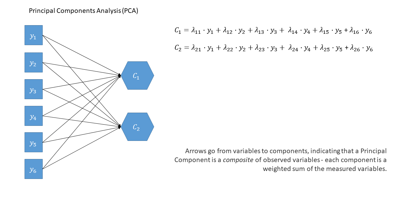 In the diagrams below, note how the directions of the arrows are different between PCA and FA - in PCA, each component \(C_i\) is the weighted combination of the observed variables \(y_1, ...,y_n\), whereas in FA, each measured variable \(y_i\) is seen as generated by some latent factor(s) \(F_i\) plus some unexplained variance \(u_i\).