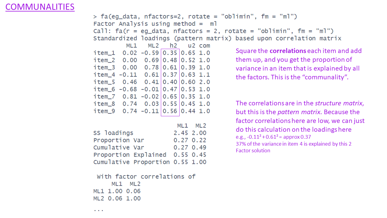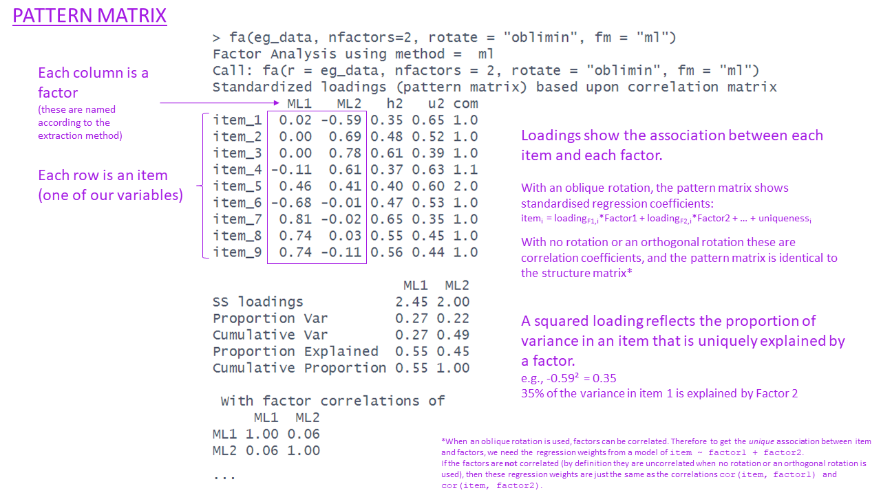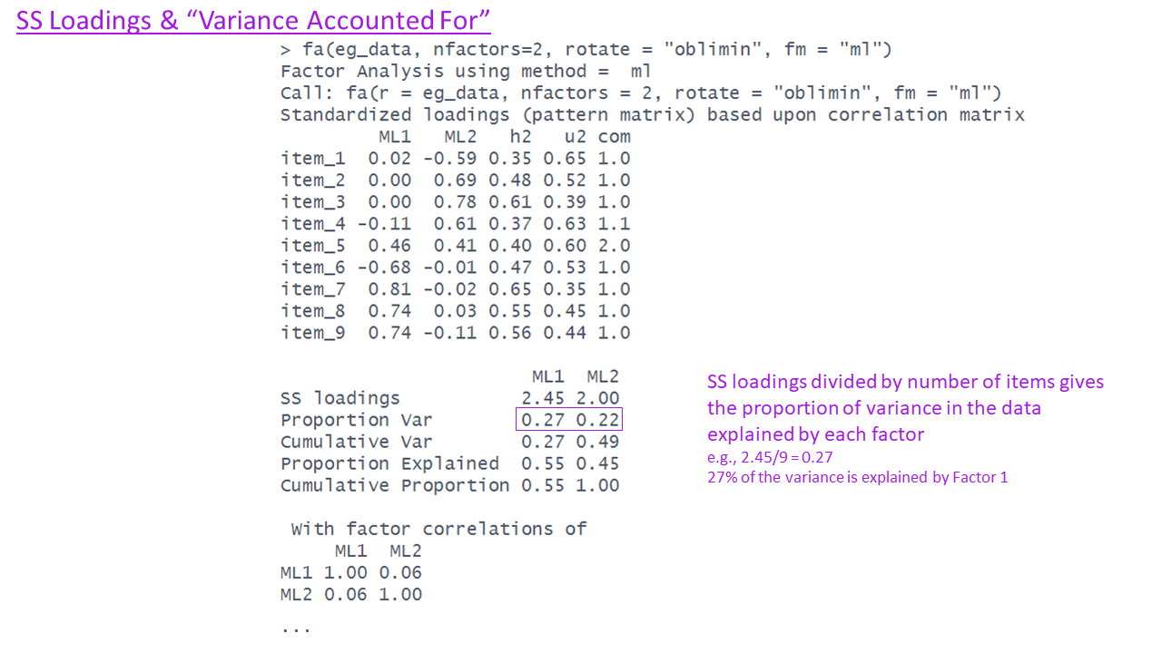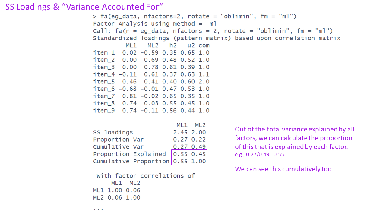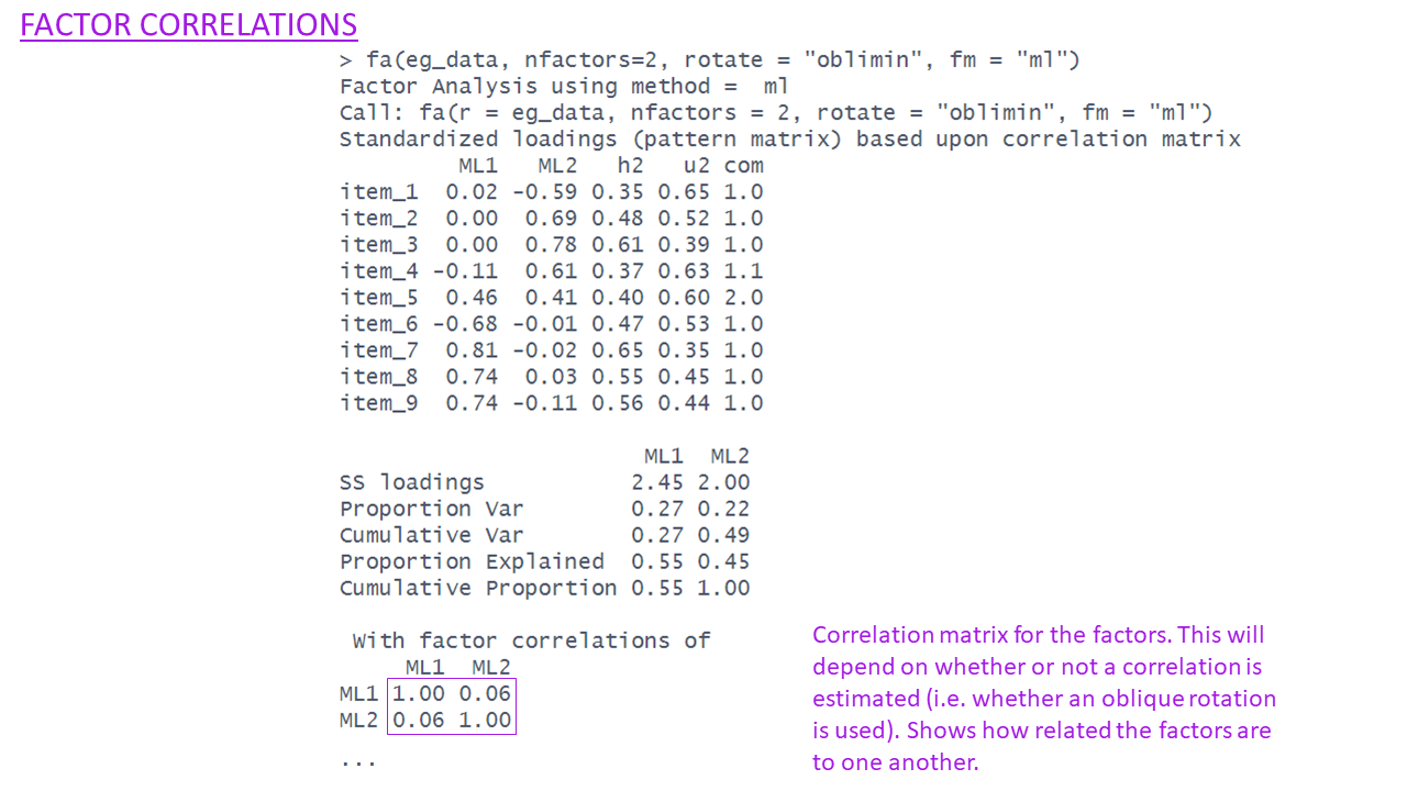 And now we have a judgment call. Both solutions look okay in terms of the numbers of items on each factor etc. One thing to consider is whether we prefer the idea of 1 thing that explains 28% of the variance, or 2 related things (the two factors are fairly correlated in the 2 factor solution) that together explain 35%. Is that a big enough increase?