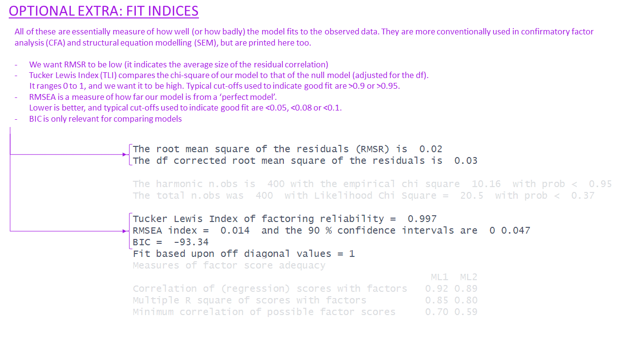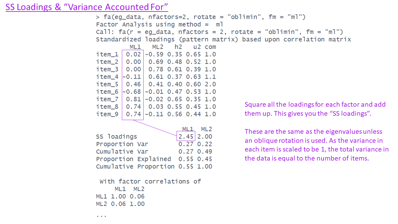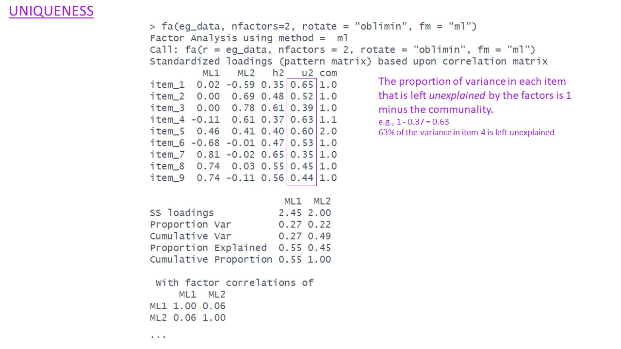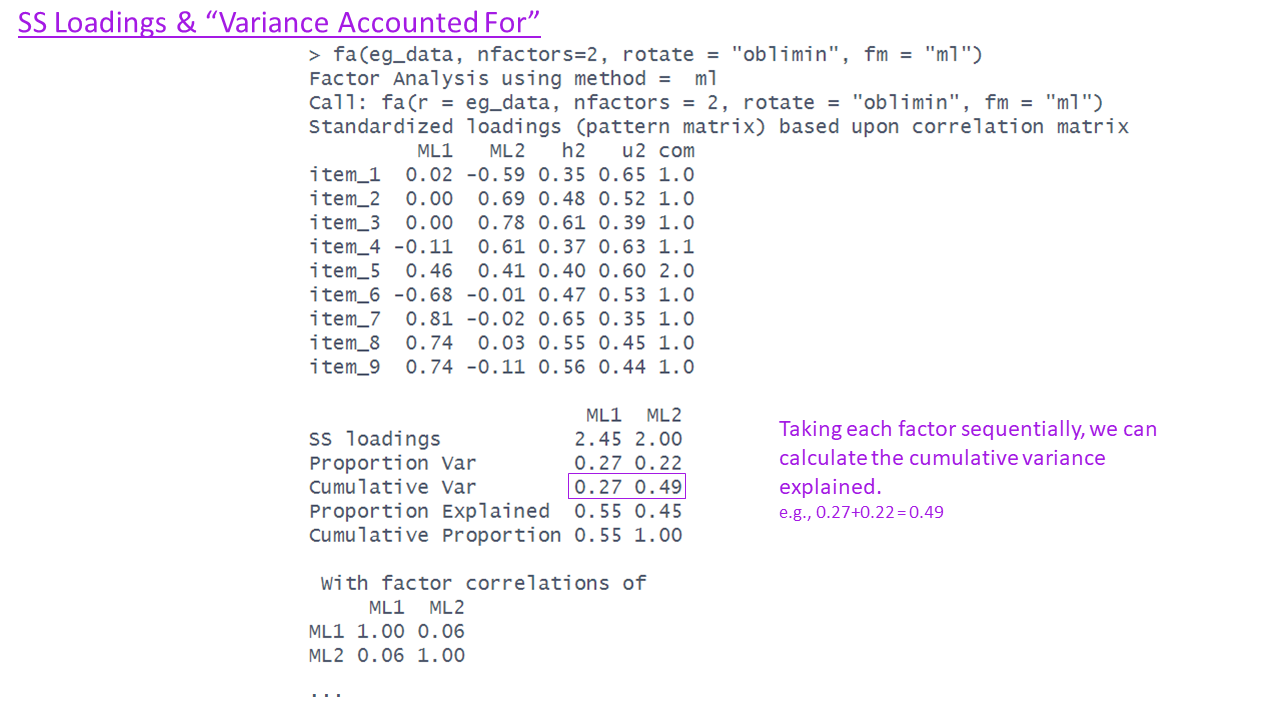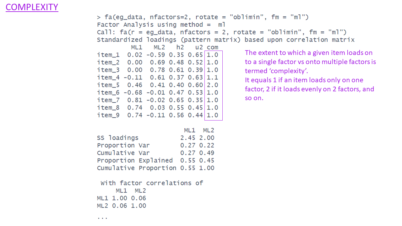 And now we have a judgment call. Both solutions look okay in terms of the numbers of items on each factor etc. One thing to consider is whether we prefer the idea of 1 thing that explains 28% of the variance, or 2 related things (the two factors are fairly correlated in the 2 factor solution) that together explain 35%. Is that a big enough increase?