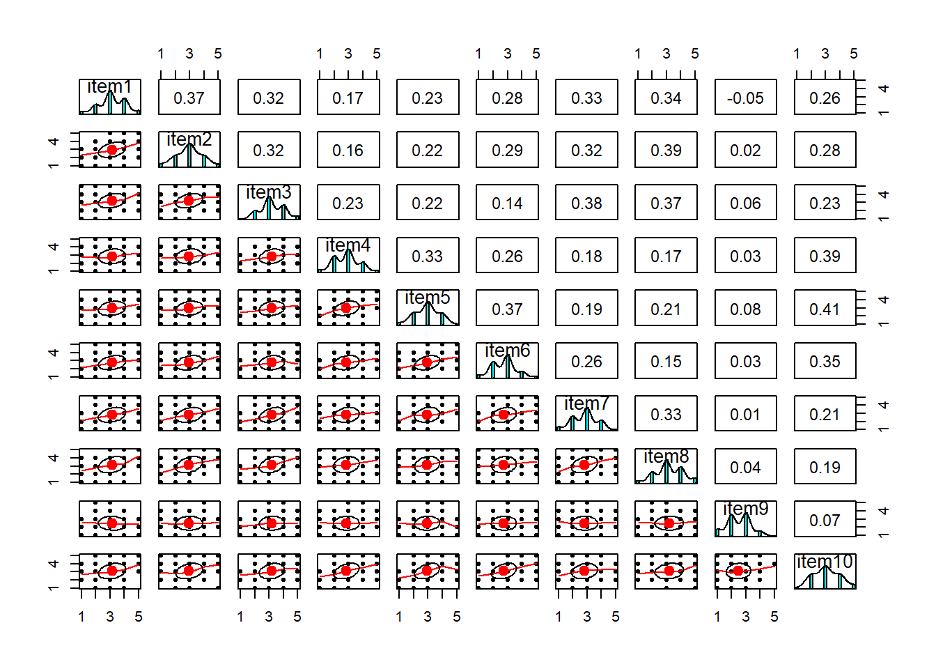 Because these items are measured on likert scales of 1-5, looking at scatterplots can be a bit harder. The red lines on the plots are essentially “smooth” lines, which follow the mean of the variable on the y-axis as it moves across the x-axis. So we want them to all be straight-ish, which they are. We can see from the diagonals of this plot that the items are all fairly normally distributed too.
