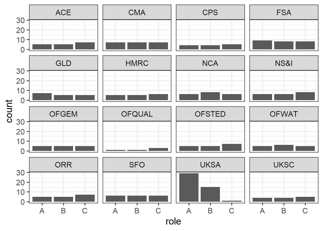 In this case, it looks like most of the departments have similar numbers of each role, apart from the UKSA (“UK Statistics Authority”), where we’ve got loads more of role A, and very few role C..