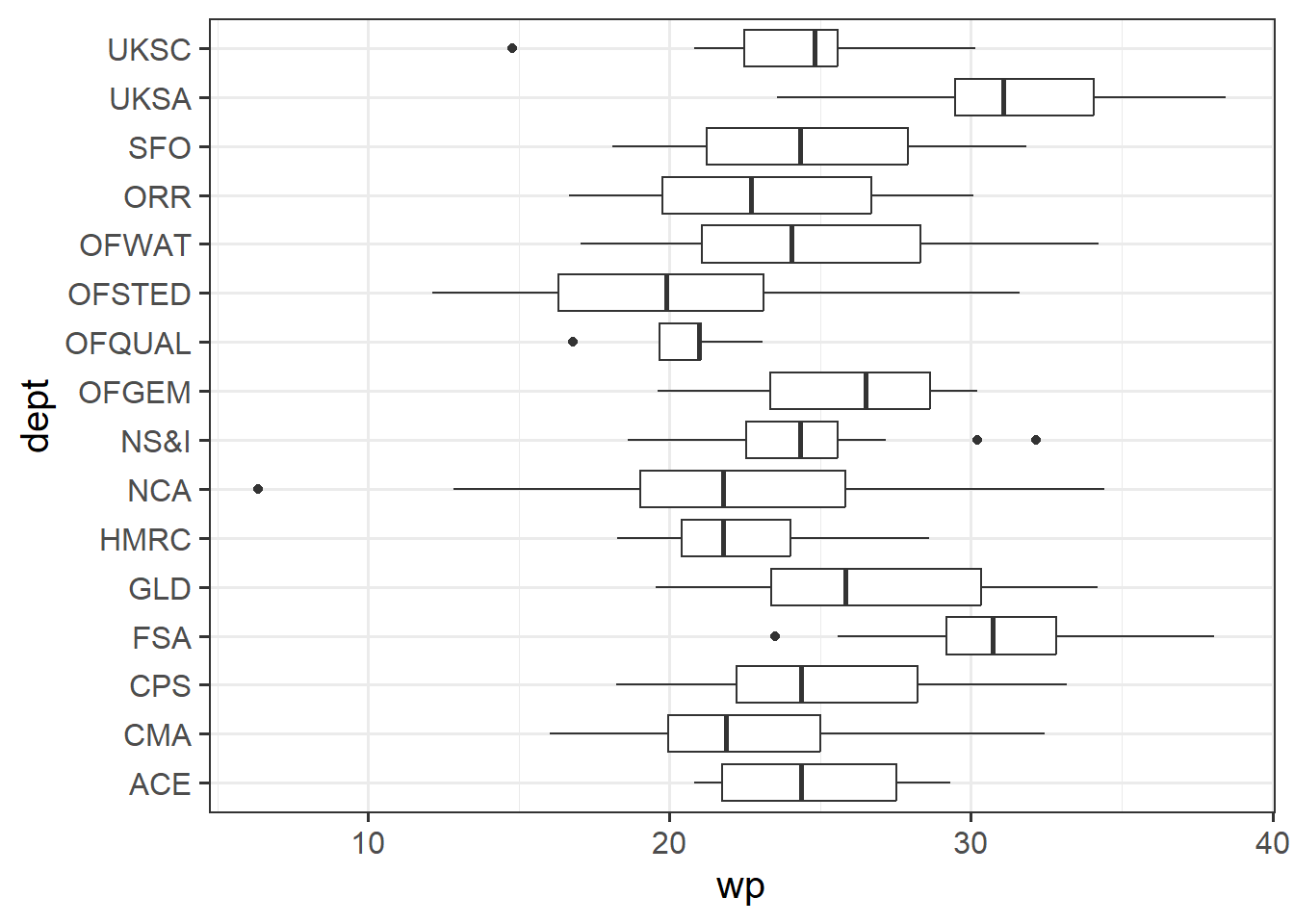 The association between wp and employment_length is clear in all these little sub-plots - there’s a downward trend. The department differences can be seen too: UKSA is generally a bit higher, HMRC and UKSC a bit lower, and so on. By default, the model captures these coefficients as ‘differences from the reference group’, so all these coefficients are in relation to the “ACE” department.