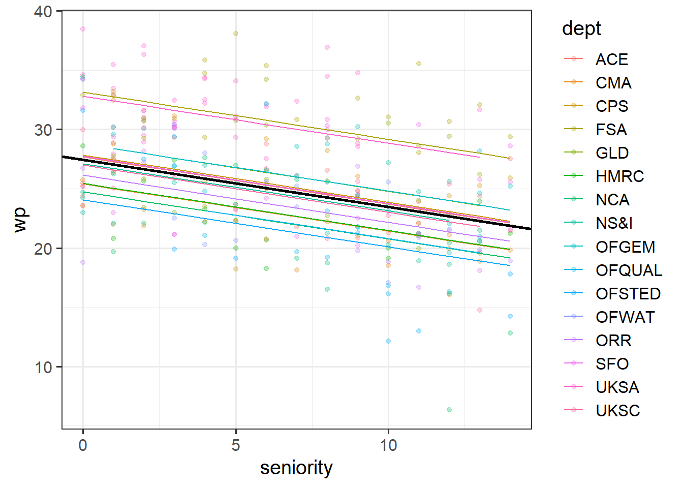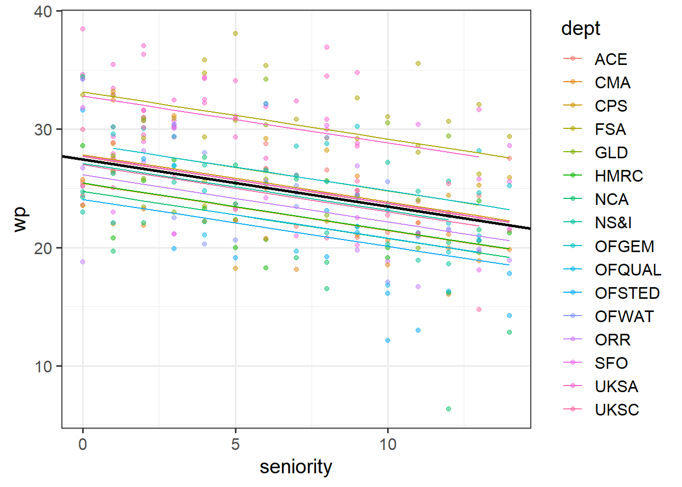 We’ve already seen in the example with the with the UK civil service employees (above) that we can visualise the fitted values (model predictions). But these were plotting all the cluster-specific values, and what we are really interested in are the estimates of (and uncertainty around) our fixed effects (i.e. estimates for clusters on average)