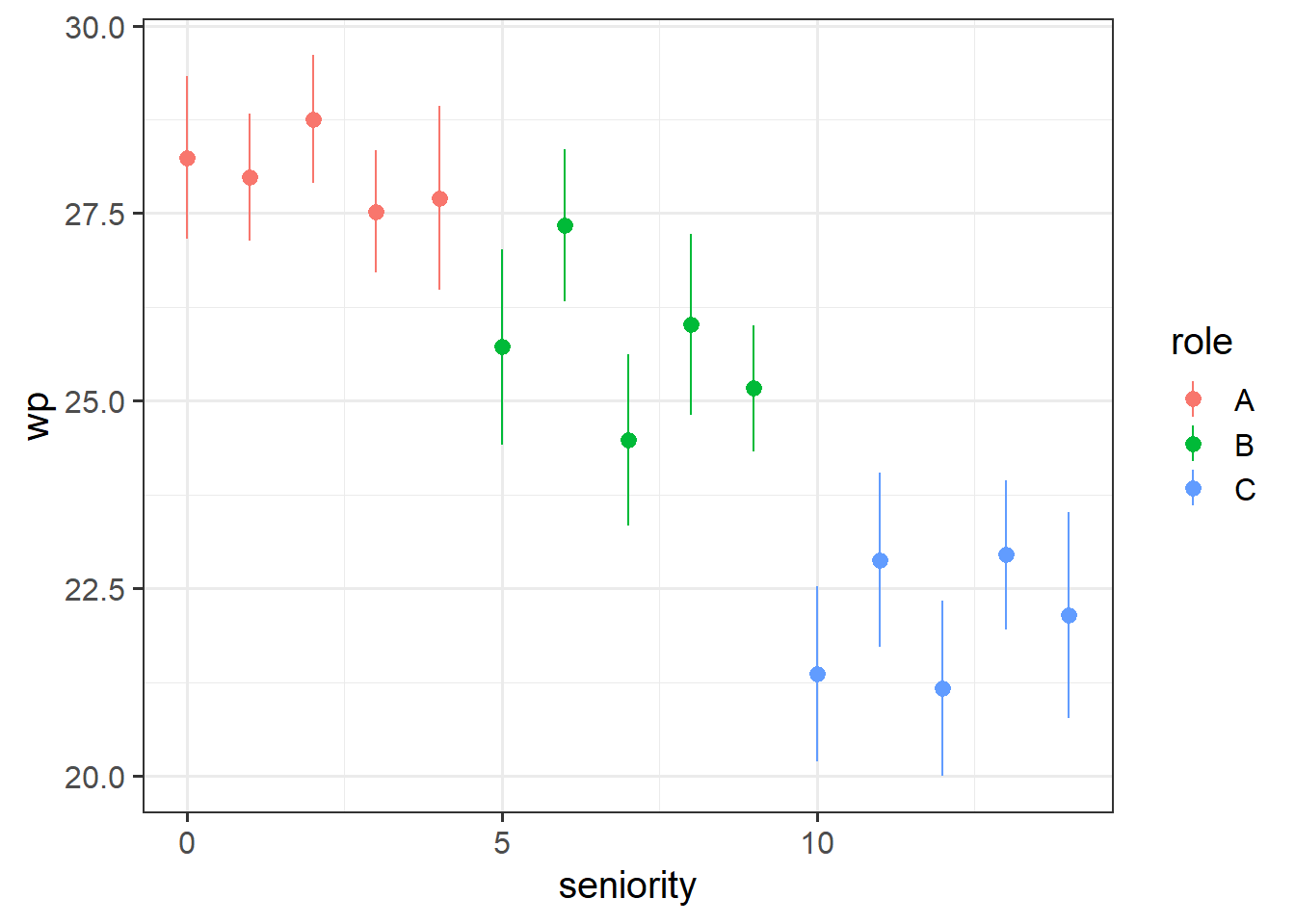 ggplot(jsup, aes(x = seniority, y = wp, col = role)) +