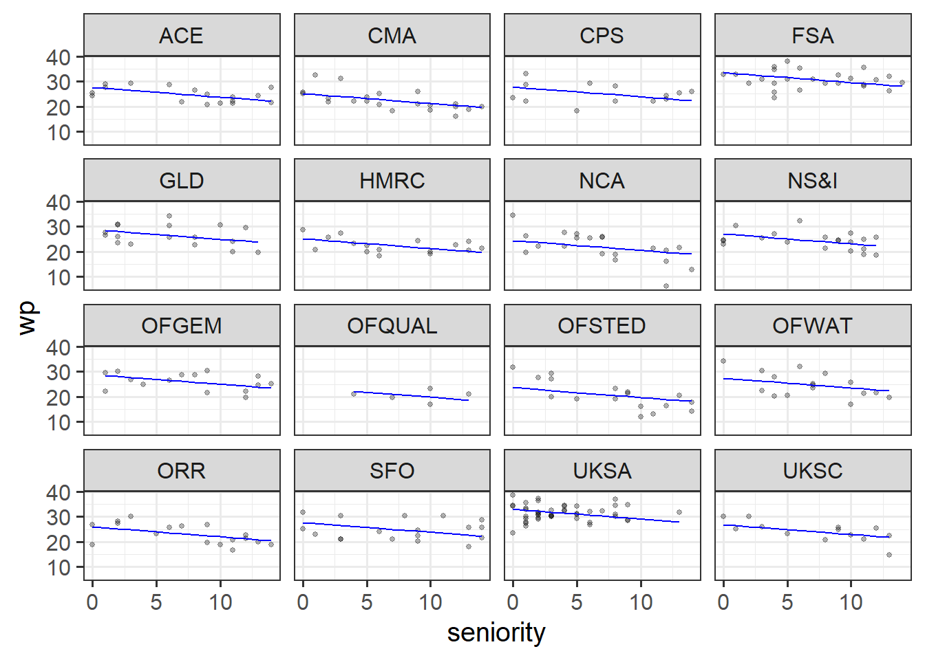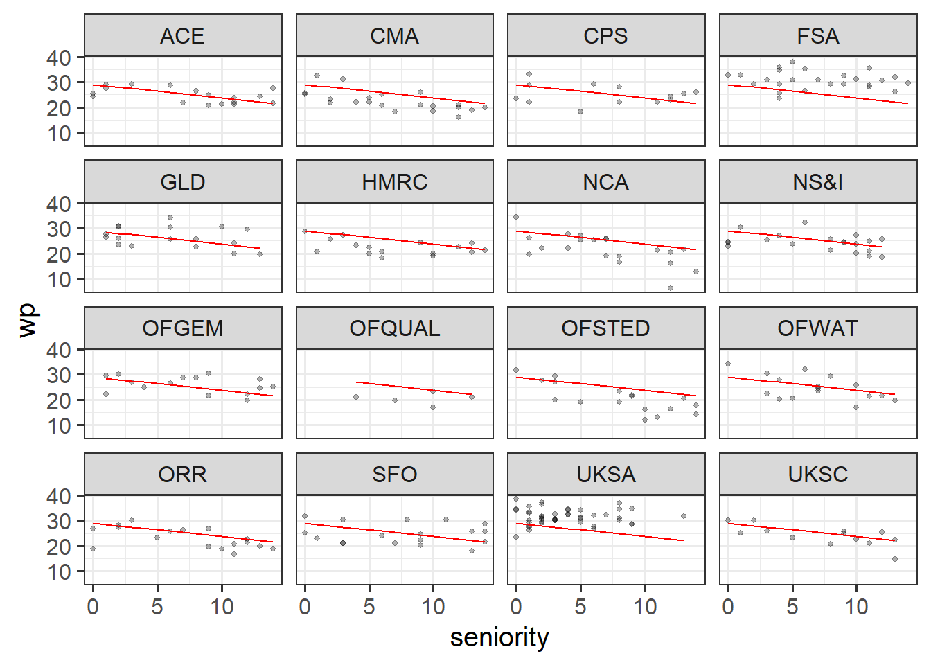 Recall the data from last week’s exercises. Instead of looking at the roles A, B and C, we’ll look in more fine grained detail at the seniority. This is mainly so that we have a continuous variable to work with as it makes this illustration easier.