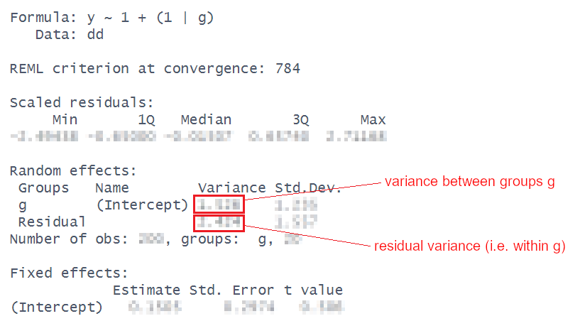 The multilevel model that has only an intercept (and the grouping structure) specified is sometimes referred to as the “null model” (or “intercept only model”). Because there are no predictors in the fixed effects there is just a single value (the intercept). All of the variance in the outcome gets modelled in the random effects part, and is partitioned into either ‘variance between groups’ or ‘residual variance’. This means we can just use those estimates to calculate the ICC.