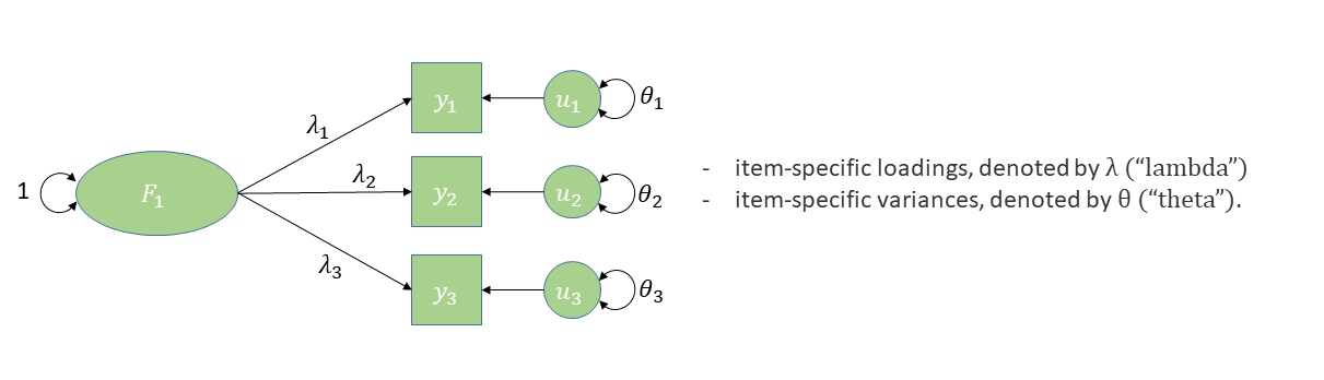 \[ \begin{align*} \omega_{total} = \frac{ \left( \sum\limits_{i=1}^{k}\lambda_i\right)^2 }{ \left(\sum\limits_{i=1}^{k}\lambda_i \right)^2 + \sum\limits_{i=1}^{k}\theta_{ii} } \\ k \text{ is the number of items in scale}\\ \lambda_i \text{ is the factor loading for item }i\\ \theta_{ii}\text{ is the error variance for item }i\\ \end{align*} \]