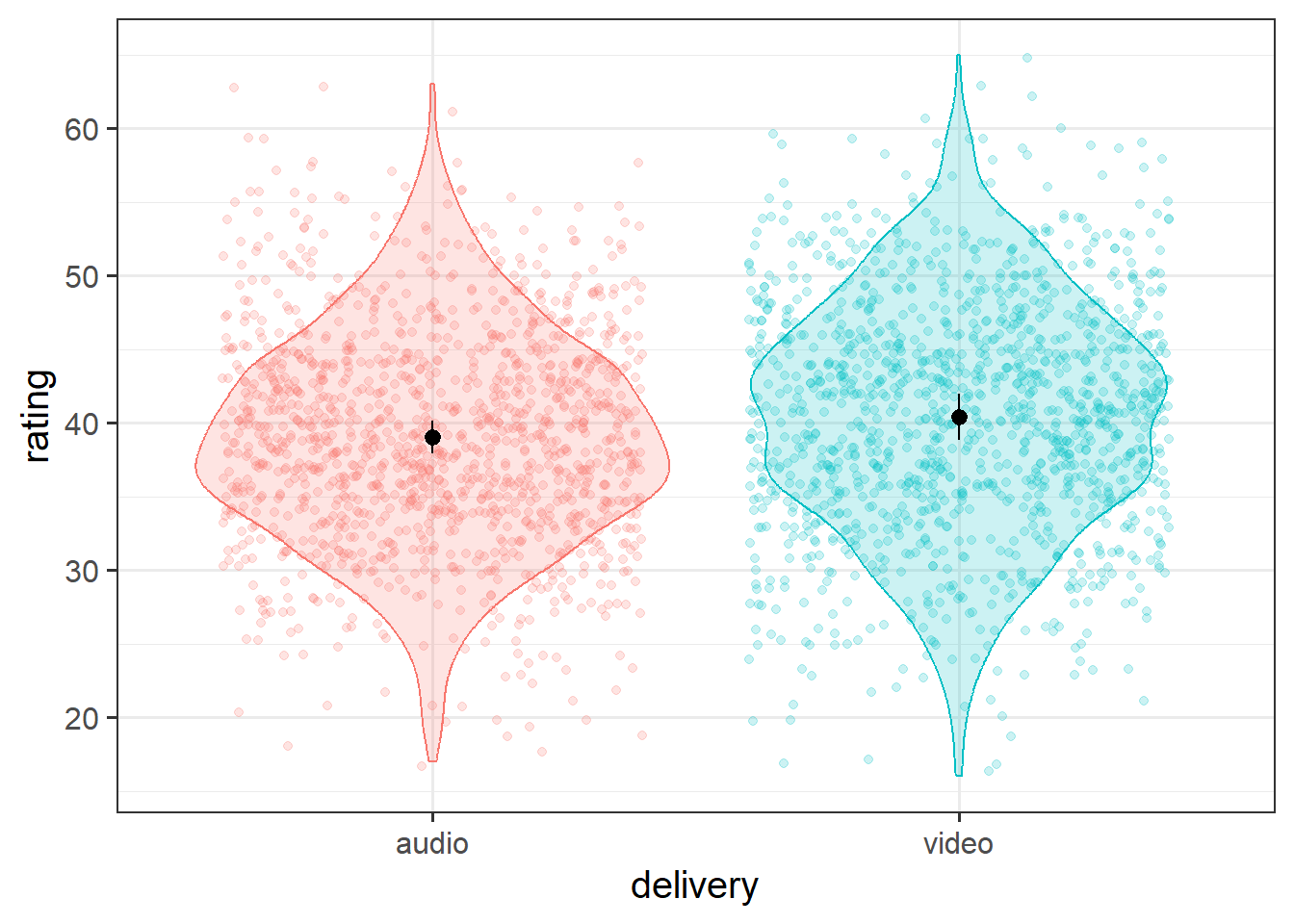It’s the correlation of joke_id’s (Intercept) and deliveryvideo adjustments here that addresses the question. The correlation is 0.39, so this tells us that jokes rated higher when presented as audio-only tend to have a bigger effect of the video.
