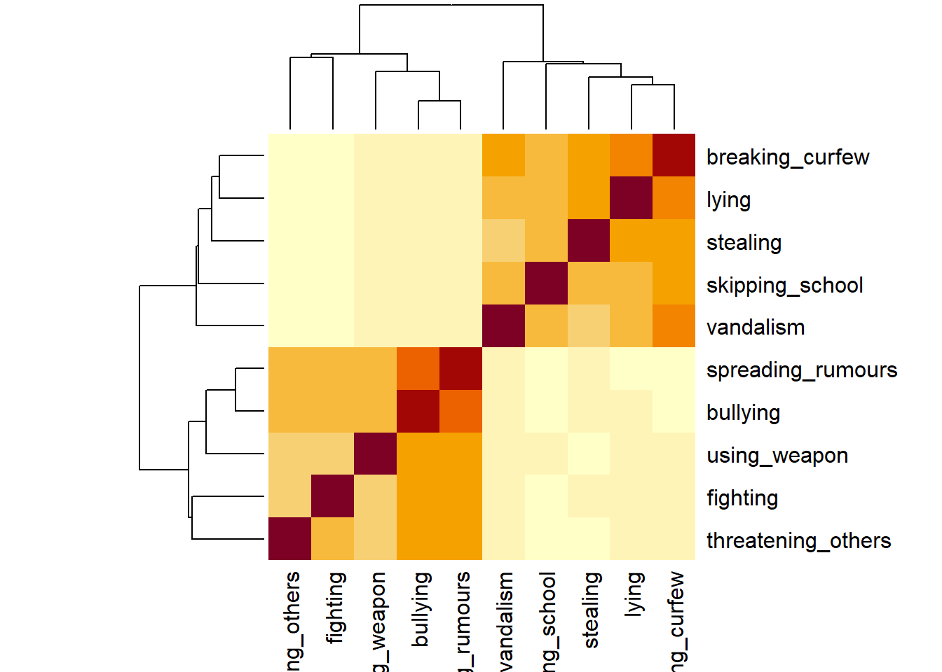 Here’s a correlation matrix visualised with heatmap(). Dark colours mean strong correlations, lighter colours mean weaker ones. Looks like we’re dealing with two obvious blocks of items here.