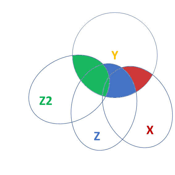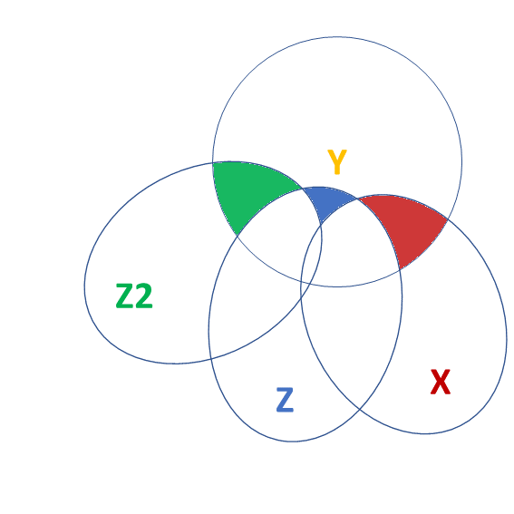 Association between X and Y is changed if we adjust for Z (a is smaller than previous slide), because there is a bit (b) that could be attributed to Z instead.