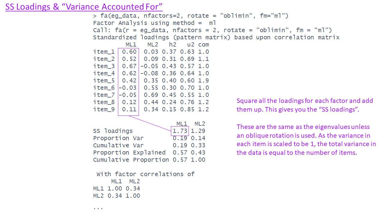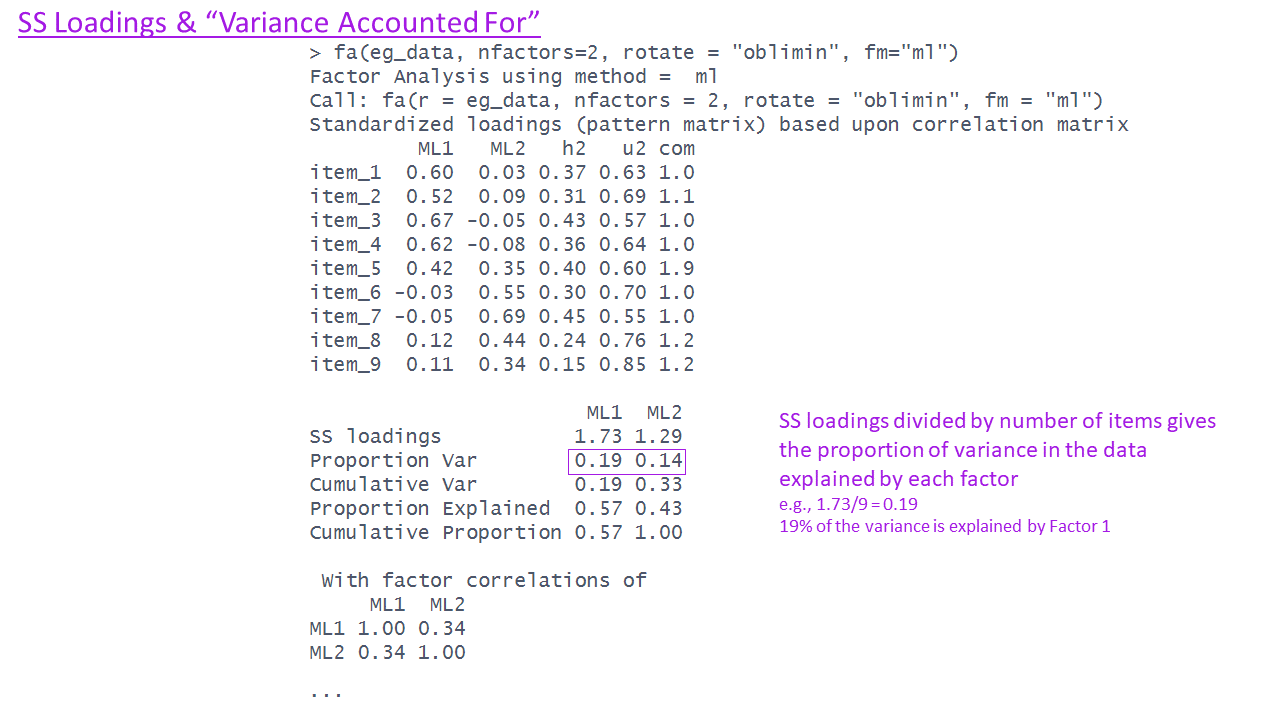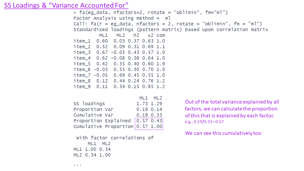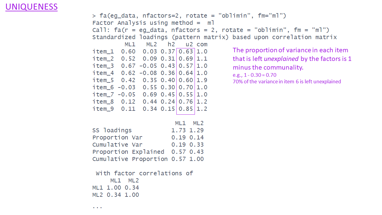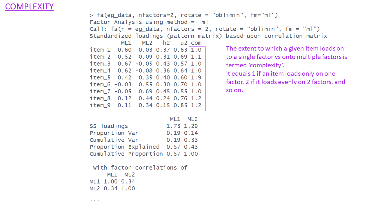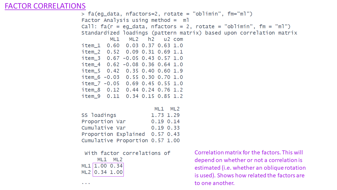 Call: fa(r = eg_data, nfactors = 2, rotate = "oblimin", fm = "ml")