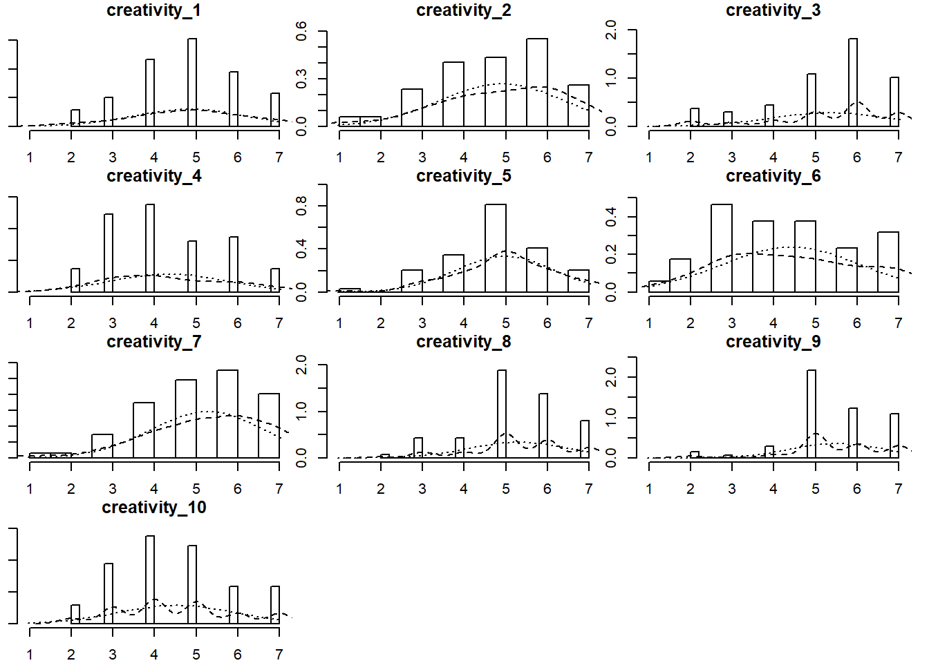 We’ll look at 1, 2 and 3 factor solutions, with oblique rotations to allow any sub-dimensions of ‘creativity’ to be correlated. Due to the deviations from normality some of the items, we’ll use principal axis factoring (PAF) to extract the factors.