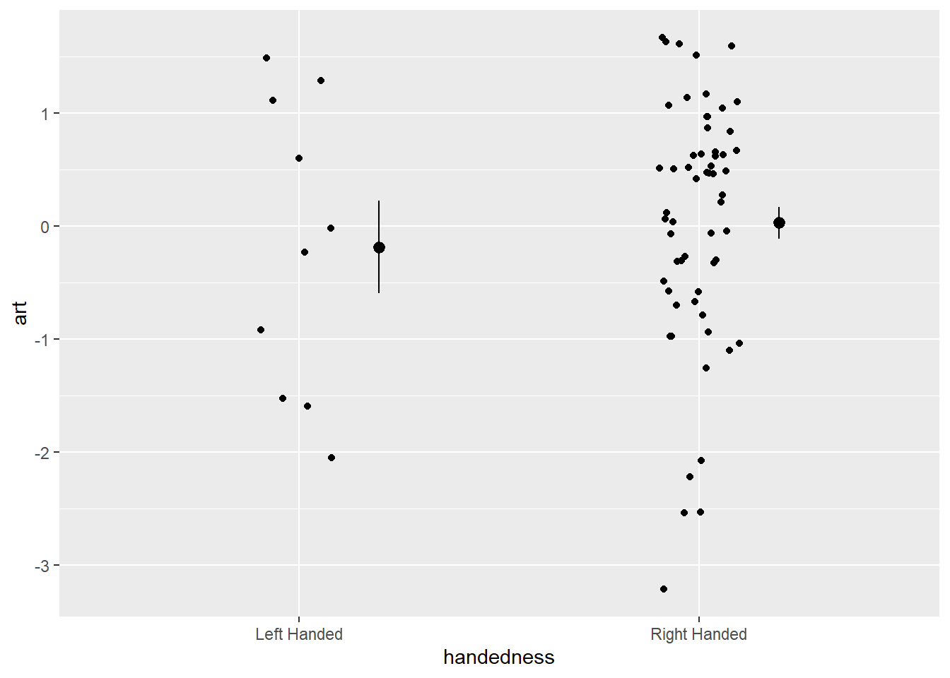 neither of these are significantly different between left and right handed people. An important thing to note here is “that absence of evidence is not evidence of absence”. So we should not write this up as “study suggests L/R handed people do not differ in creativity”.