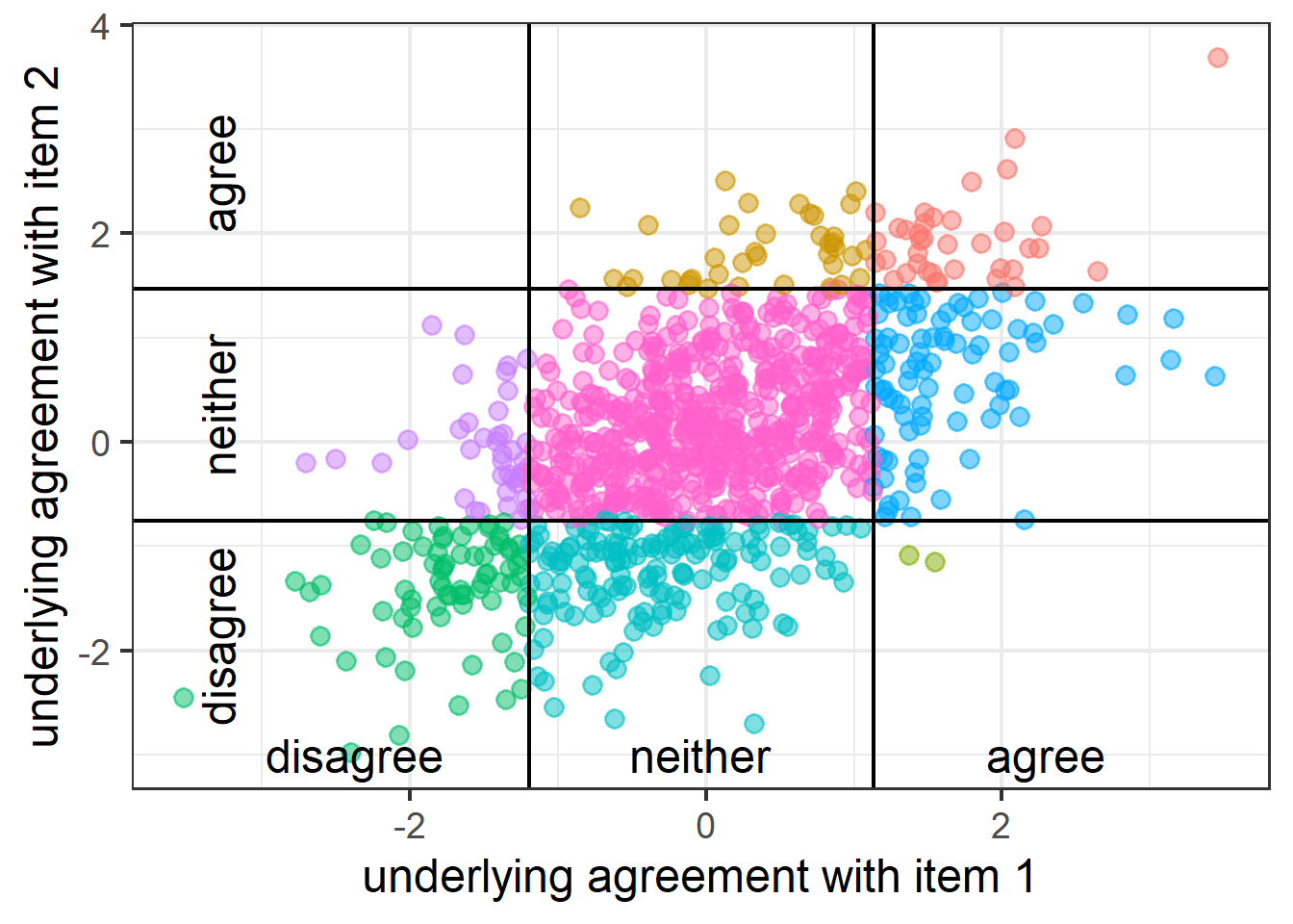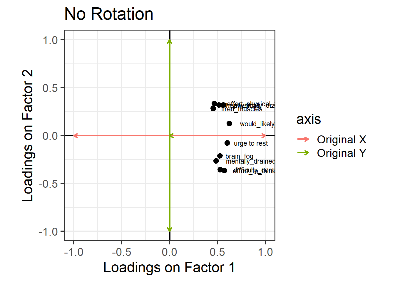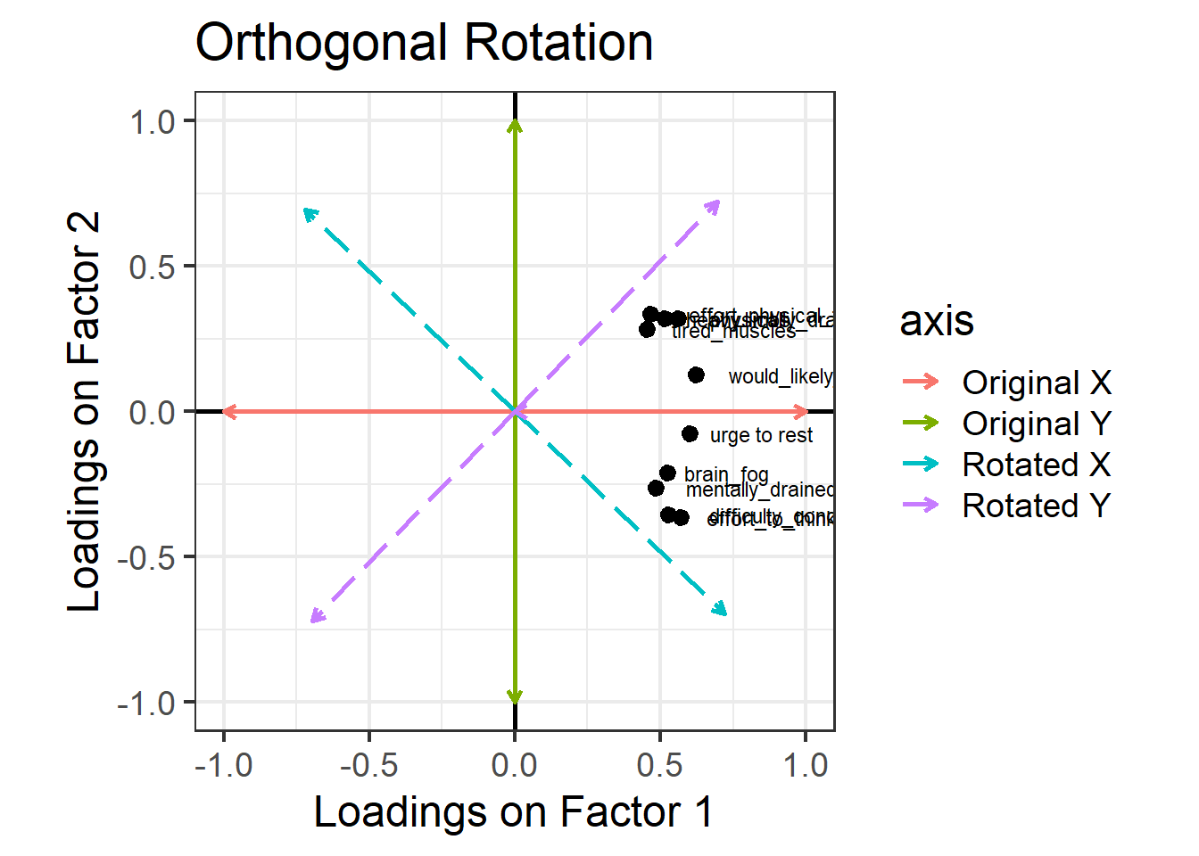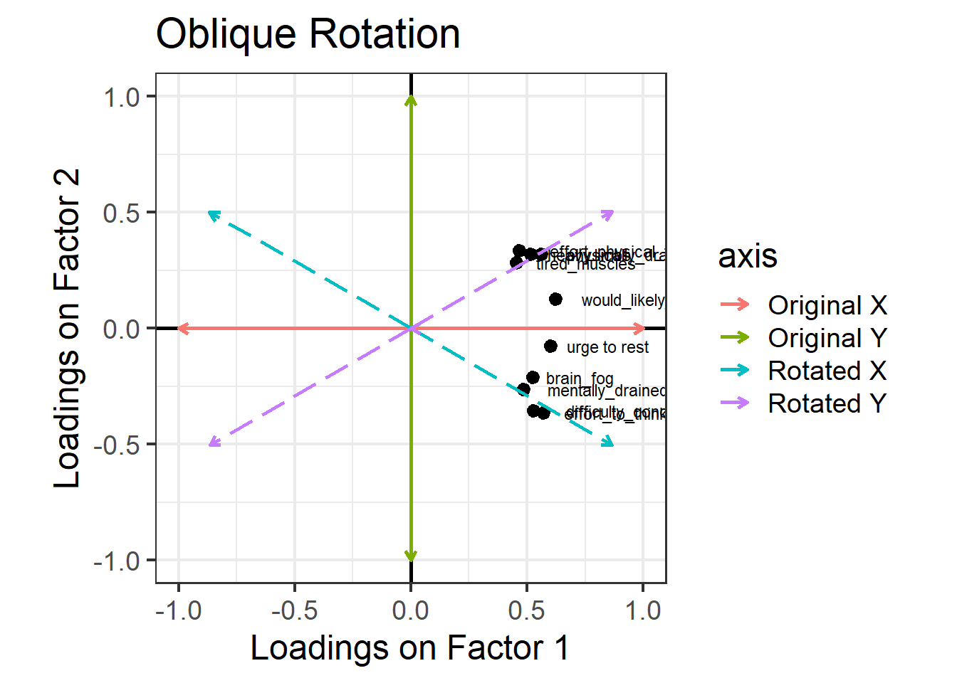 Even if these two factors are not correlated, then an oblique rotation could estimate that too. The point of an oblique rotation is that we’re not forcing the factors to be uncorrelated.↩︎
