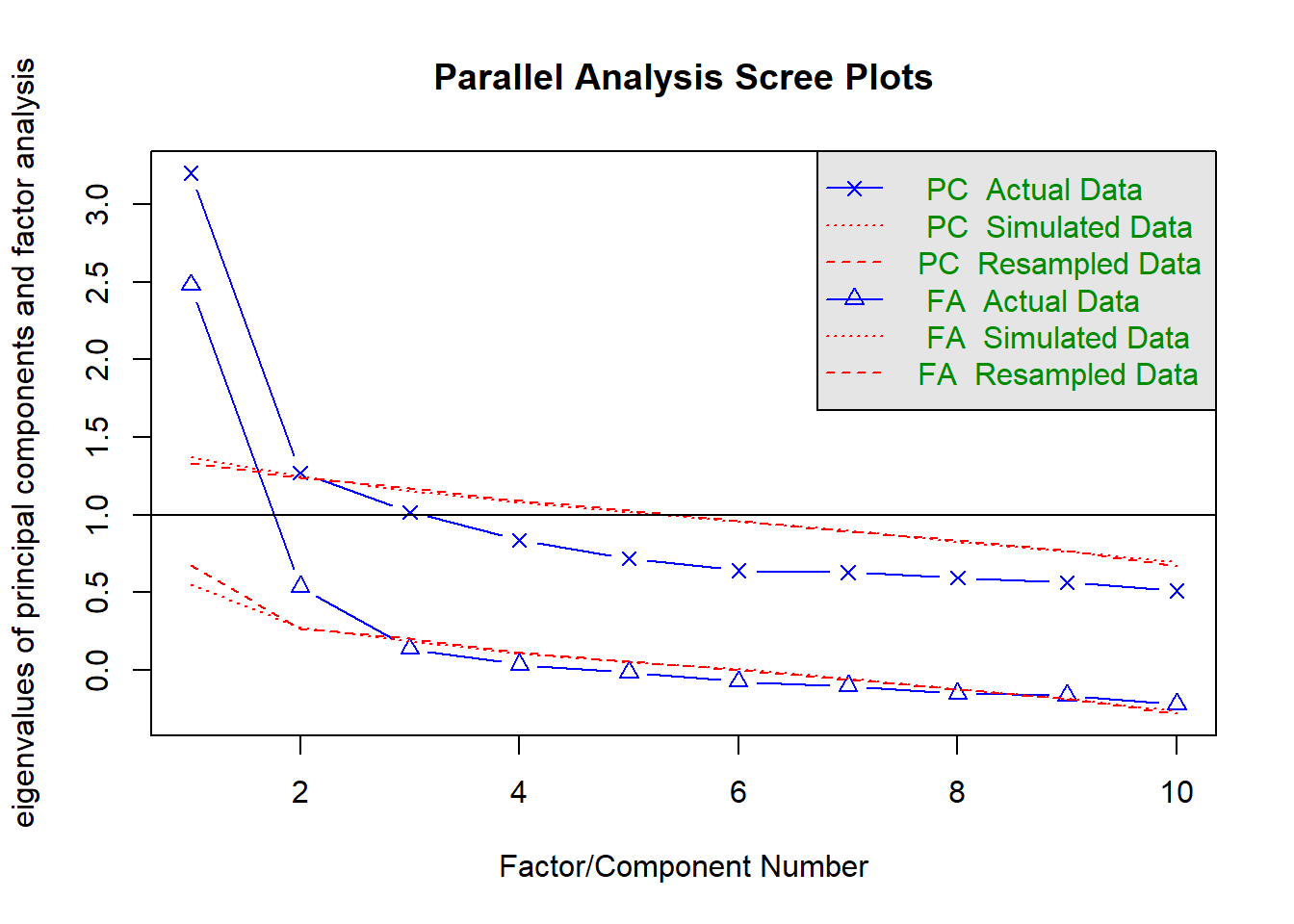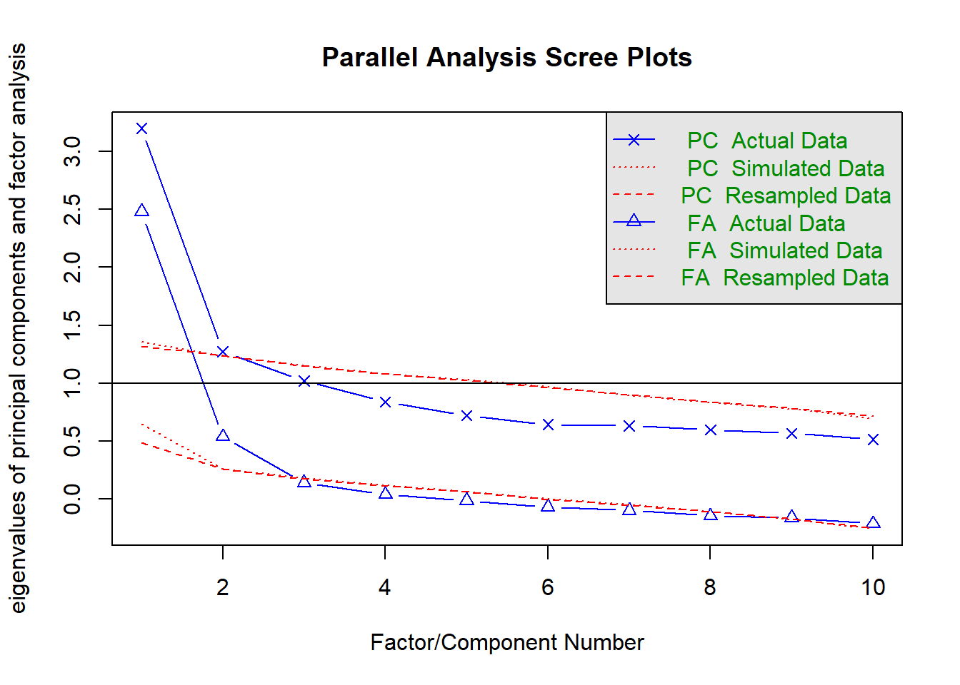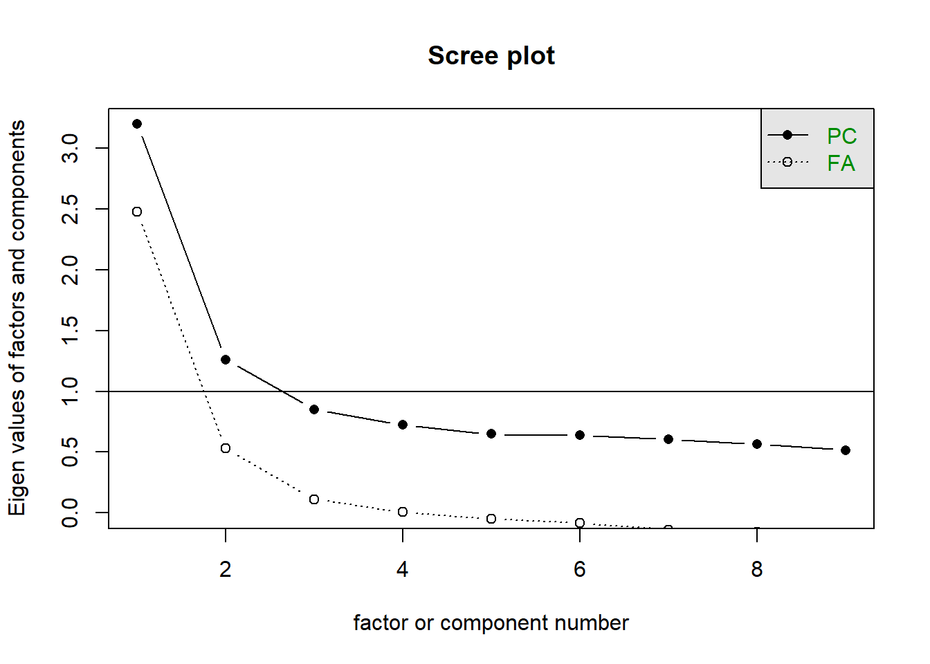 Removing item9, and doing the entire process over again, we end up still finding that it’s between a 1 or a 2 factor solution.