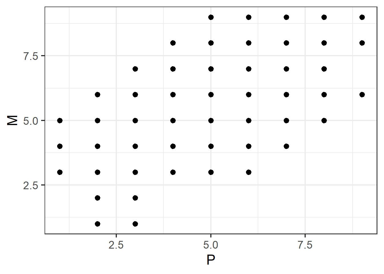 Let’s look back at our data on mental fatigue (M), physical fatigue (P), and sleepiness (S). We’ll plot physical fatigue against mental fatigue.