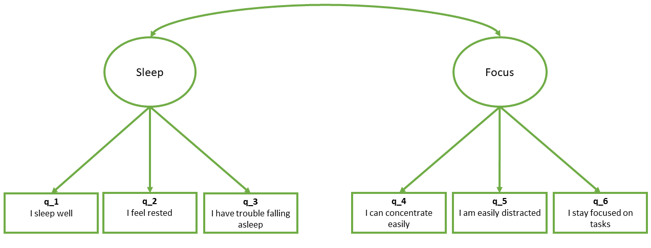 If what we are trying to measure is “quality of sleep” then I would like to think the first item will be more strongly associated with this than the second two — I might have good quality sleep but still never feel rested, or I might have good quality sleep but take ages to actually fall asleep. Other possible items we might have had here such as “I often need coffee to keep going through the day” would clearly have much more “unique” variance because they don’t even specifically mention sleep.