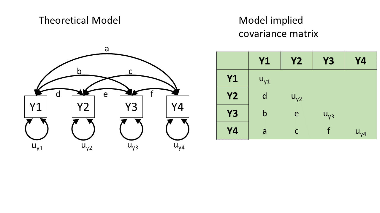 This model will estimate the covariances between each pair of variables, and so we can perfectly reproduce any observed covariance matrix. We started with 10 things in the covariance matrix (four variances and six covariances), and the model has to estimate those same 10 things (letters \(a\) to \(f\) and \(u_{y1}\) to \(u_{y4}\) in Figure 4). (There’s no point to talking about “model fit” for this model, because its fit to the data is already perfect! There’s no variability, no extra data points, that it hasn’t accounted for. We’ll talk about this in more detail in the degrees of freedom section below!)