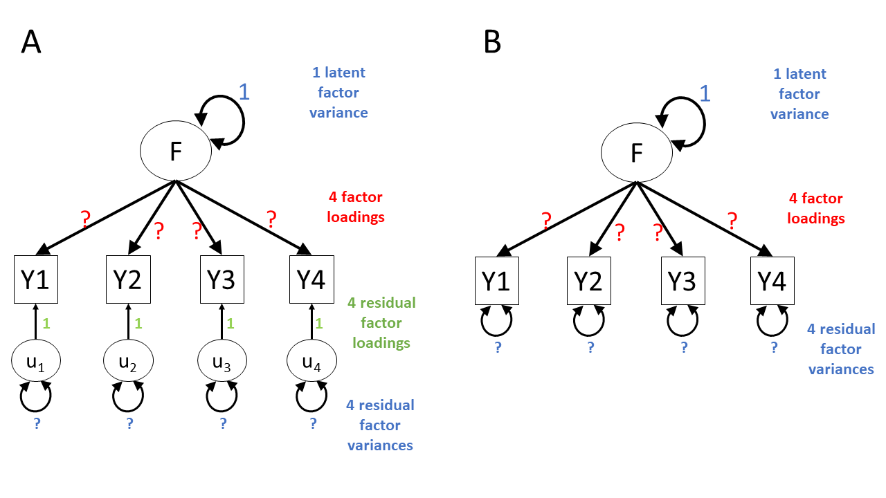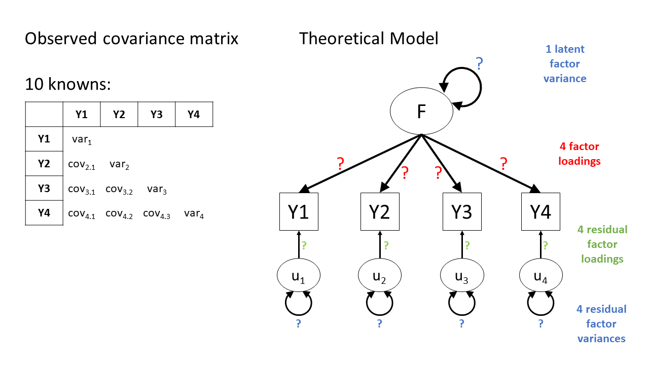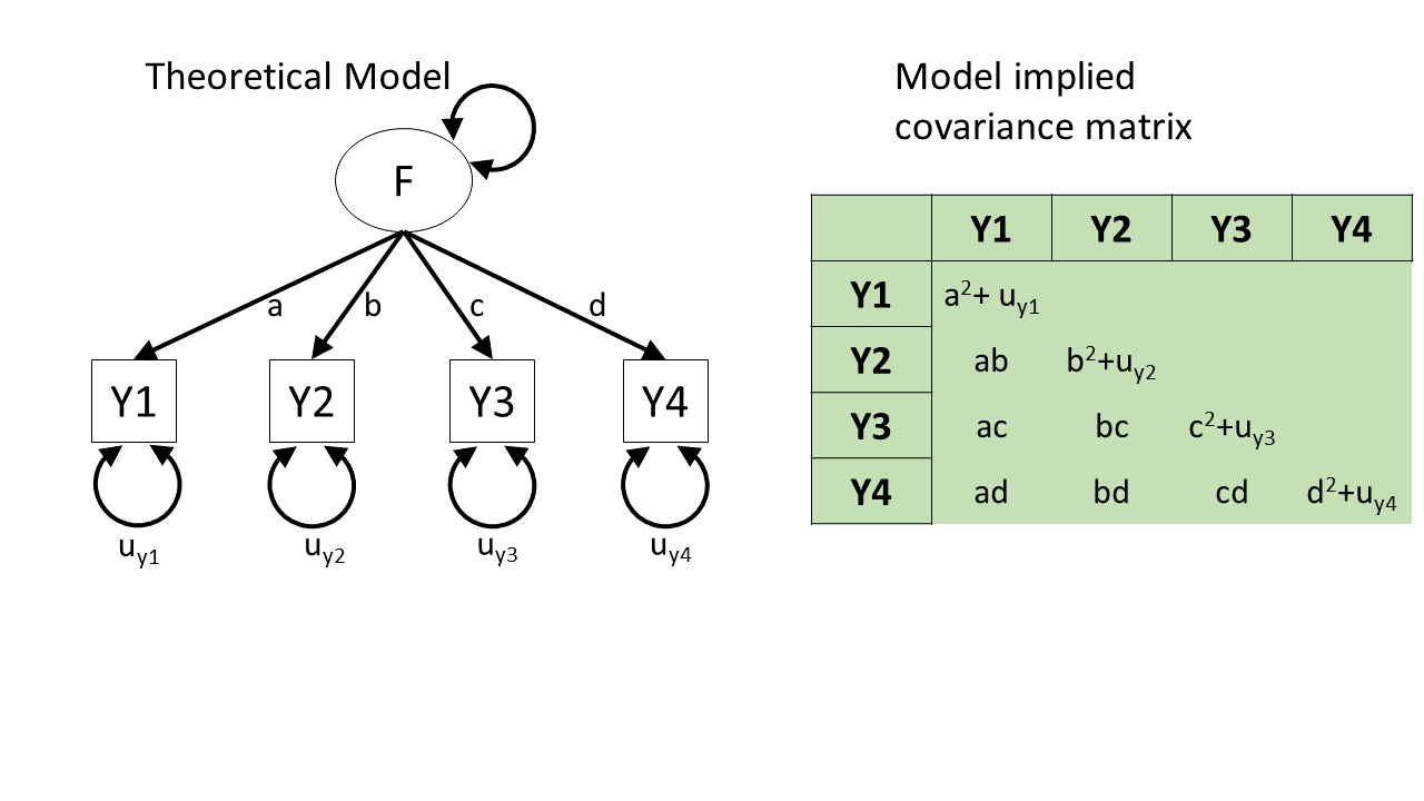 After so much time working in a regression world, where we can think of each value on the outcome variable being predicted by some combination of the predictor variables, it can be a bit odd to think about how models like CFA and SEM predict the values in a covariance matrix. The missing link is probably easiest described by showing what different theoretical models imply for a covariance matrix.