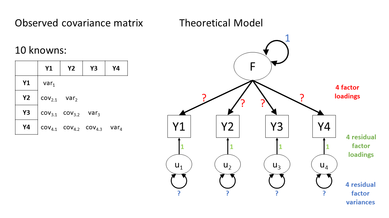 If we collect data on those four variables and fit this model to that data, it’ll use some optimisation method like maximum likelihood estimation to estimate the model parameters \(u_{y1}\) to \(u_{y4}\), and it will not estimate any covariances between the variables because we told it that the covariances are 0.