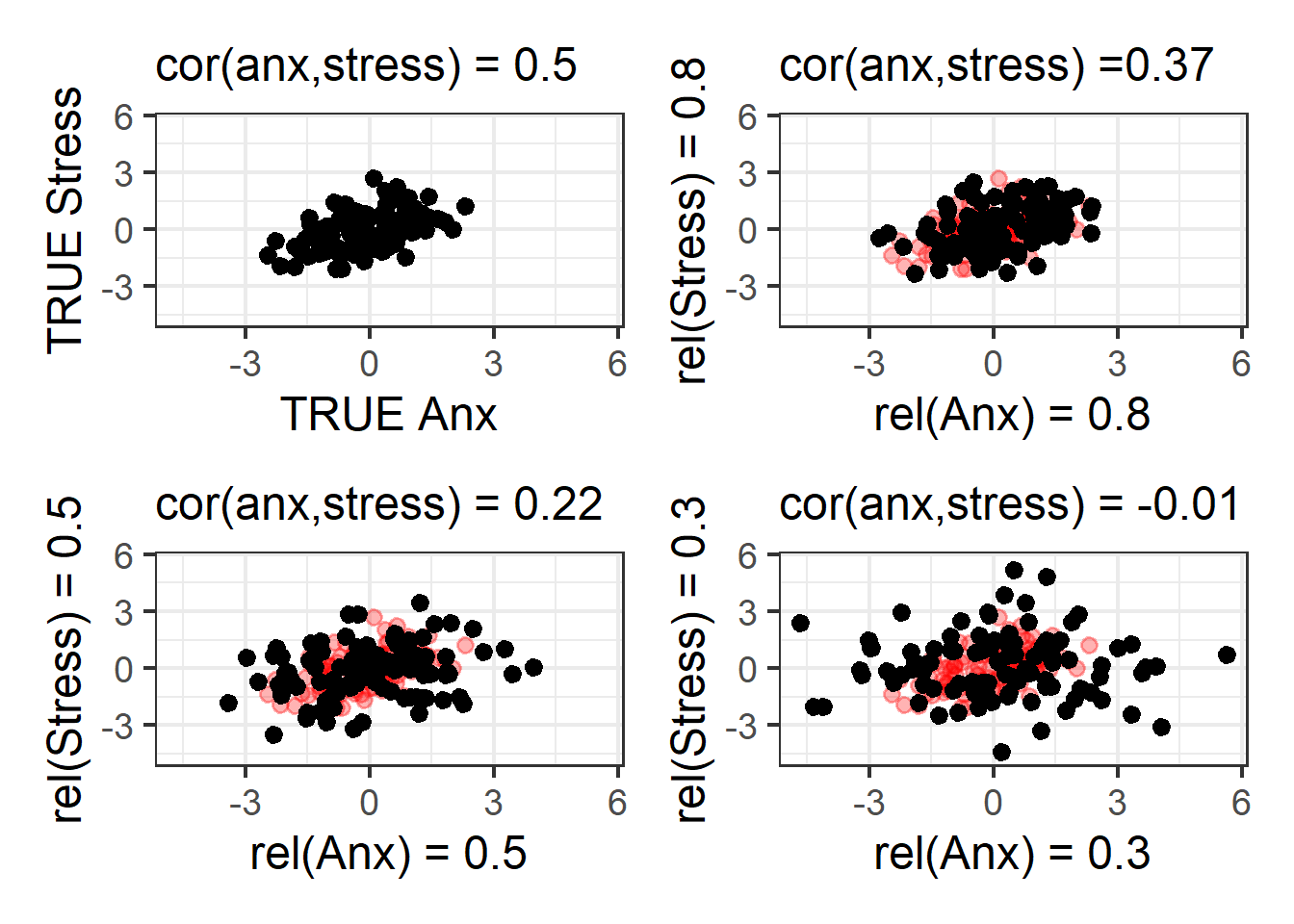 For instance, suppose we are trying to estimate the correlation between two things, like “stress” and “anxiety”, and if we could measure them absolutely perfectly, we would see they are correlated 0.5 (Figure 6 Top-Left). We can never actually do this because measurements are never perfect. Depending on how bad our measures are (of either thing), then the random error introduced into our scatterplot results in a weaker correlation.
