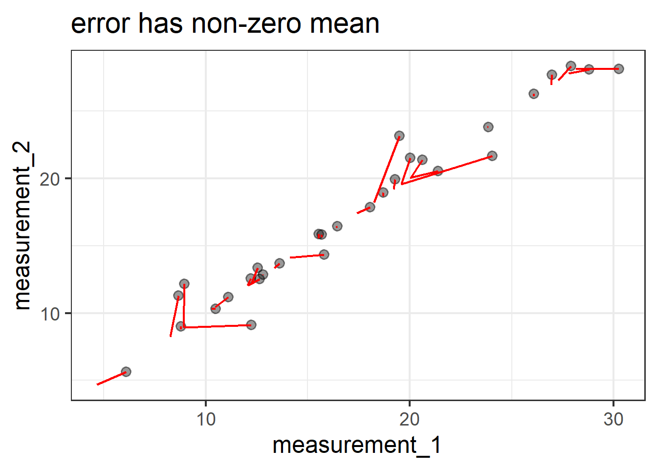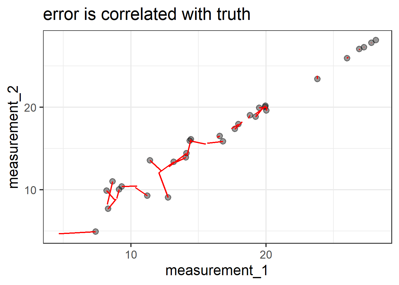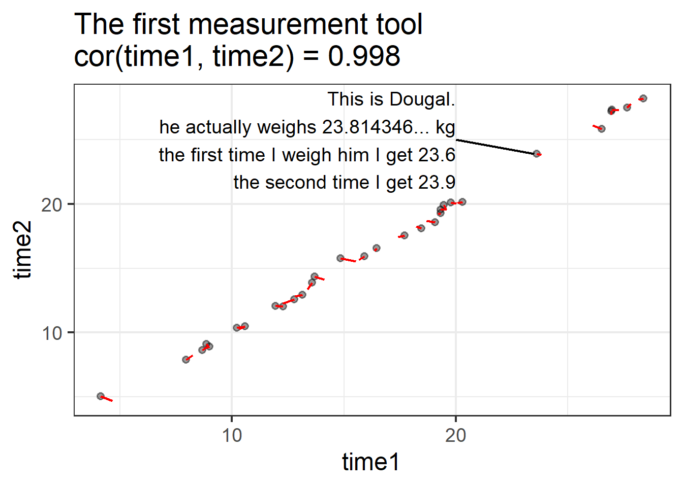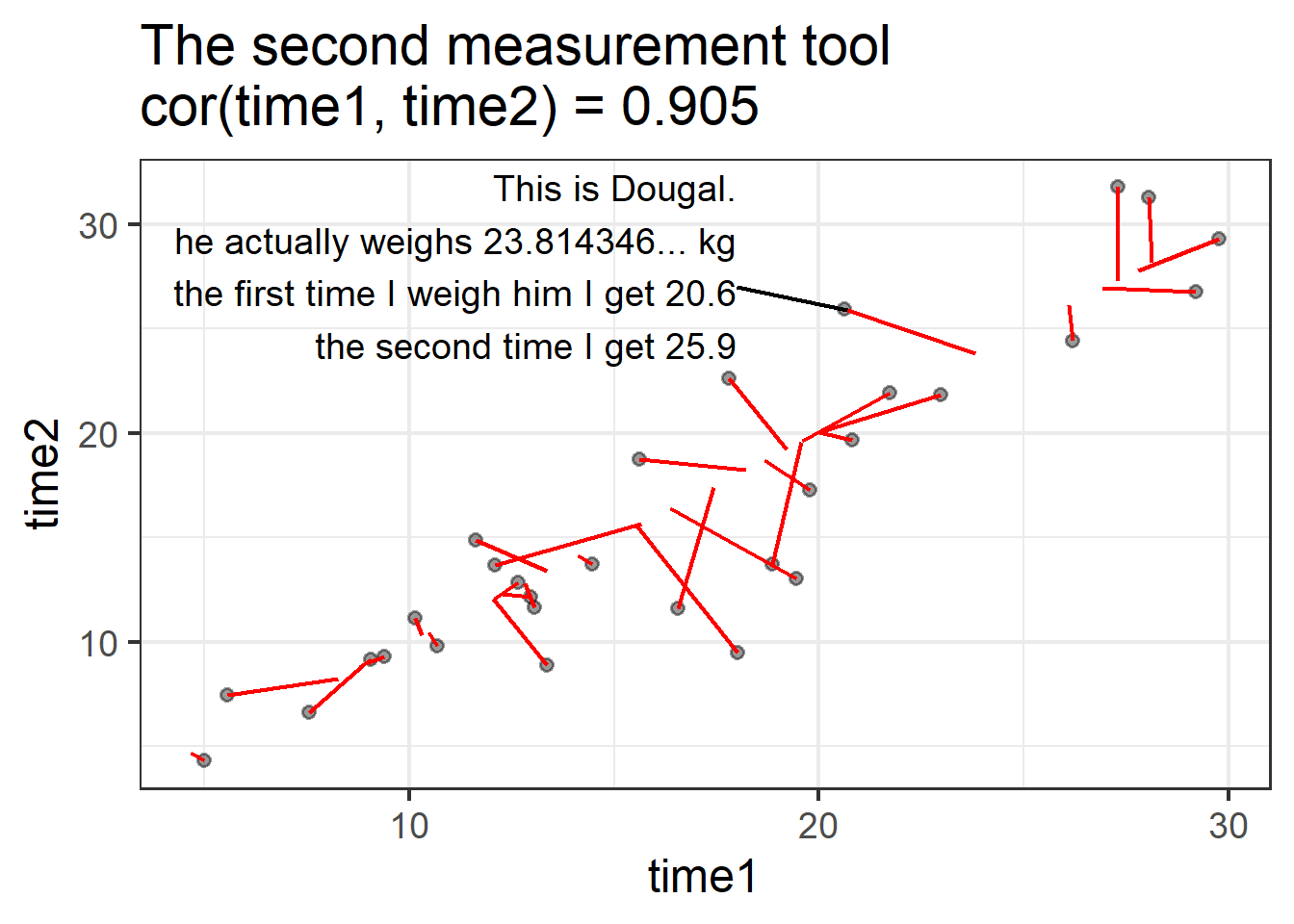 In this plot, each dog is represented by one dot. The dot shows their measured value at time 1 and at time 2. The red line shows how far the measured value is from their true weight (which, if the measure were perfectly reliable, would appear on the plot as a perfect diagonal). So the first measurement tool isn’t perfectly reliable, but the correlation between time 1 and time 2 is very good!