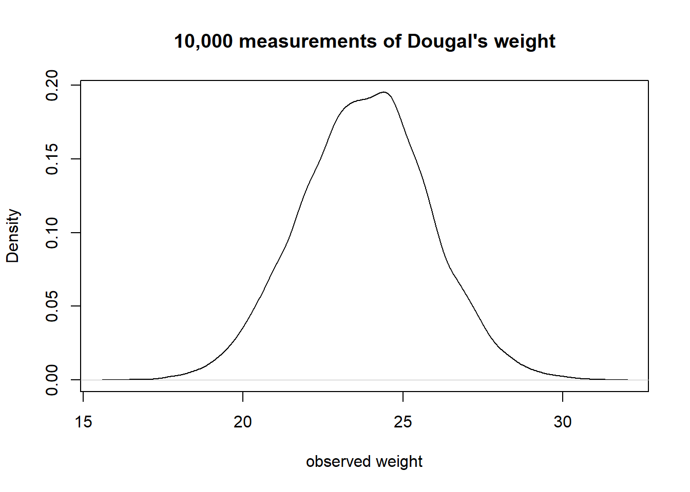 One way to make the idea of “truth” here a little more concrete: let’s suppose that I took my shoddy bathroom scales and weighed Dougal over and over and over and over again (ad infinitum). The numbers I get out will follow a normal distribution, the center of which we can think of as Dougal’s “true” weight (assuming the scales aren’t systematically biased). We often see weights a little higher, often a little lower, less often do we see things a lot higher or lower, etc. So “Truth” here refers to the idea of the ‘long run’ measurement.