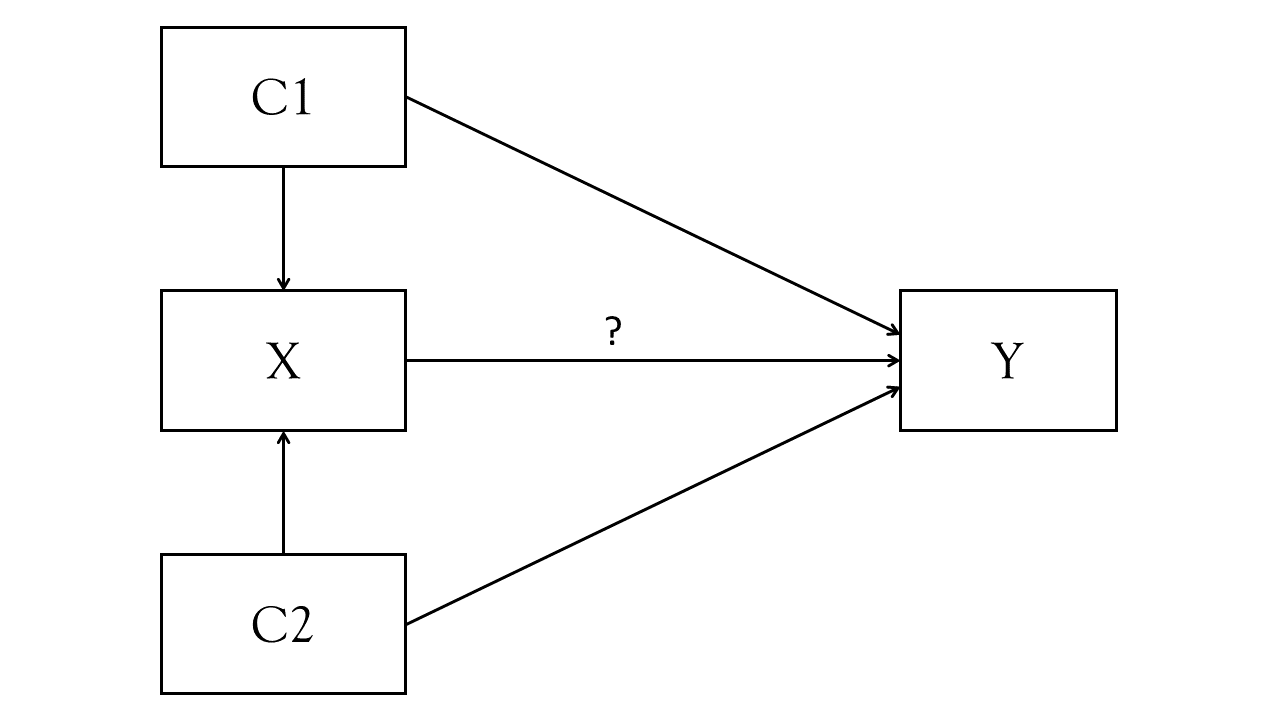 Sometimes, the end goal is just to get out something descriptive or associational (“X tends to co-occur with Y”), and sometimes our aim is to try and estimate an ‘effect’ (“if we change X, this is what happens to Y”1). When we can justify using words like “effect” and other language that implies a certain degree of causality2, we are working with theoretical models that would look something similar to Figure 1. The path from X to Y (the thing we’re interested in, labelled with a ?) as “the effect of X on Y”, and we might use something like lm(Y ~ C1 + C2 + X) to get our estimated effect. We control for C1 and C2 because our understanding (i.e., Figure 1) indicates that not doing so could bias our estimate of the effect of X on Y.