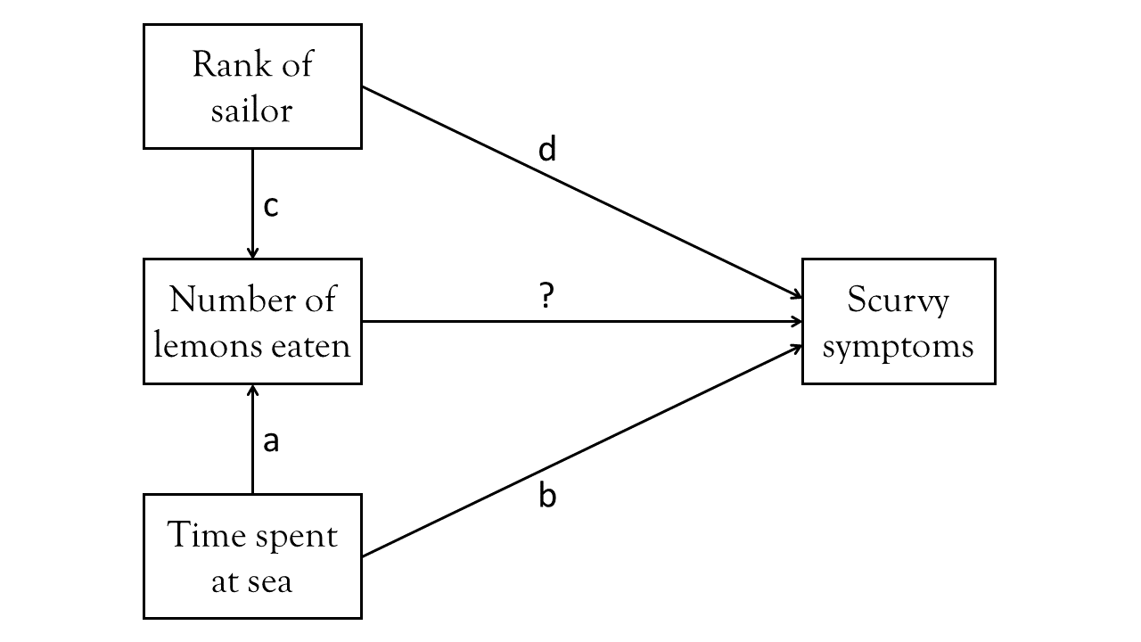 A diagram such as Figure 2 displays what we believe about the relationships between these variables. Sailors who spend more time at sea will probably eat more lemons (path a), and they will also have more time at sea to develop scurvy (path b). Higher ranking sailors will probably have more access to lemons (path c), and will potentially have more hygeinic conditions meaning fewer scurvy symptoms (path d). Finally, the bit we want to actually estimate is the change in scurvy symptoms when eating more lemons (path ?).
