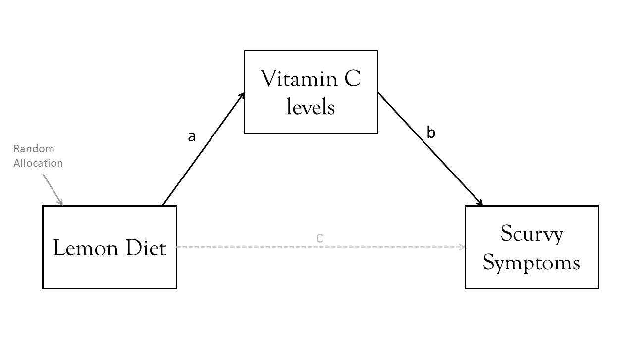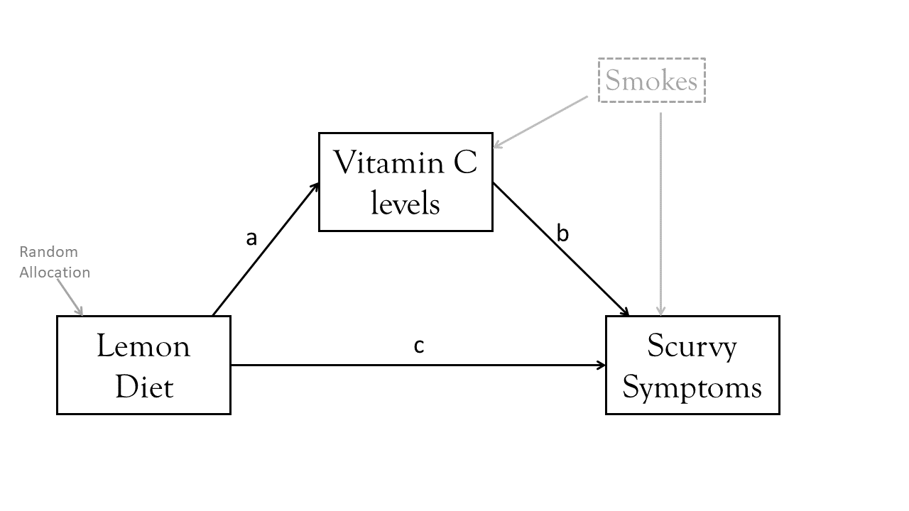 Continuing our example, we might ask “does eating lemons reduce scurvy because of Vitamin C?”. Suppose that we do a randomised trial, where we send 100 sailors off with a diet of 1 lemon per week, and another 100 sailors off with no lemons whatsoever. This is a great approach, because it avoids the problems of Figure 2 where we had confounding variables). When the sailors all come back, we measure their levels of vitamin C, and assess them for scurvy.