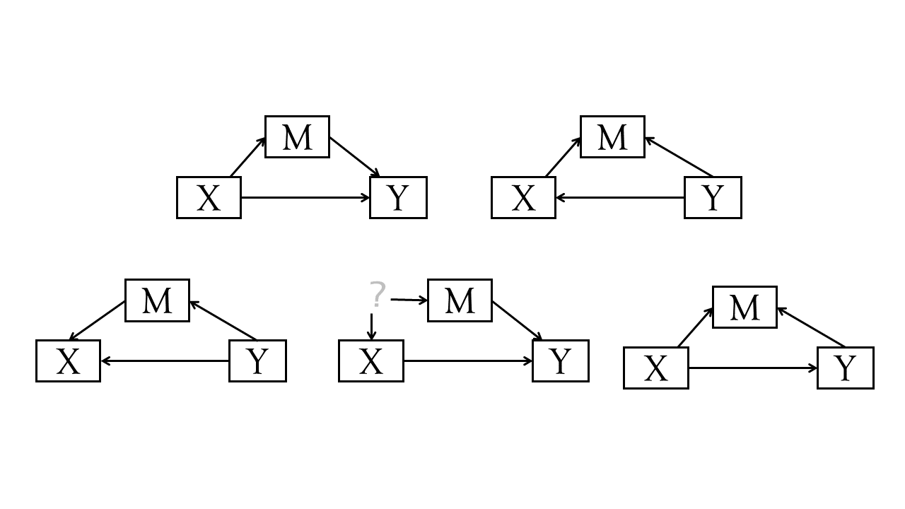 That said, this lack of model fit raises an interesting point about mediation, which is that all of the models in displayed in Figure 6 will fit equally well (i.e., perfectly!)