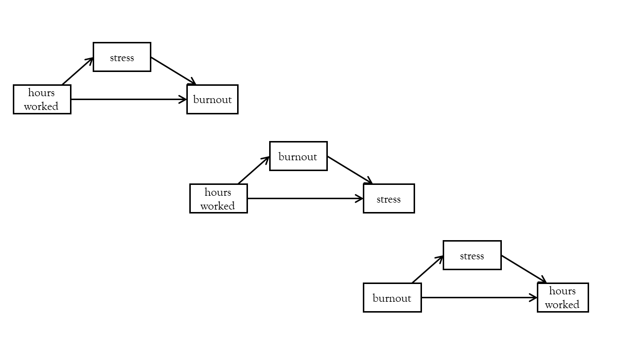 One common problem comes with doing “cross-sectional” mediation - i.e., you measure everything — X, M and Y — all at once, and then assess how much m mediates X->Y. The problem here is that we’re making very strong directional assumptions that X causes M (and not vice versa) and M causes Y (and not vice versa). This is especially common in psychology, where the things we are measuring a pretty difficult to measure! For example, lets suppose we do a survey and everybody gets scored on three variables: hours_worked, stress and burnout. We’re making a strong assumption by fitting model A, when model B or C could be just as valid, and will fit the data equally well (remember all these models have zero degrees of freedom - they all ‘fit’ perfectly!). One can make reasonable arguments for all of these — i.e., is it that if people work more hours then they feel more stressed? or could it be that if people stress about work, perhaps they tend to work more hours to try to alleviate the stress?