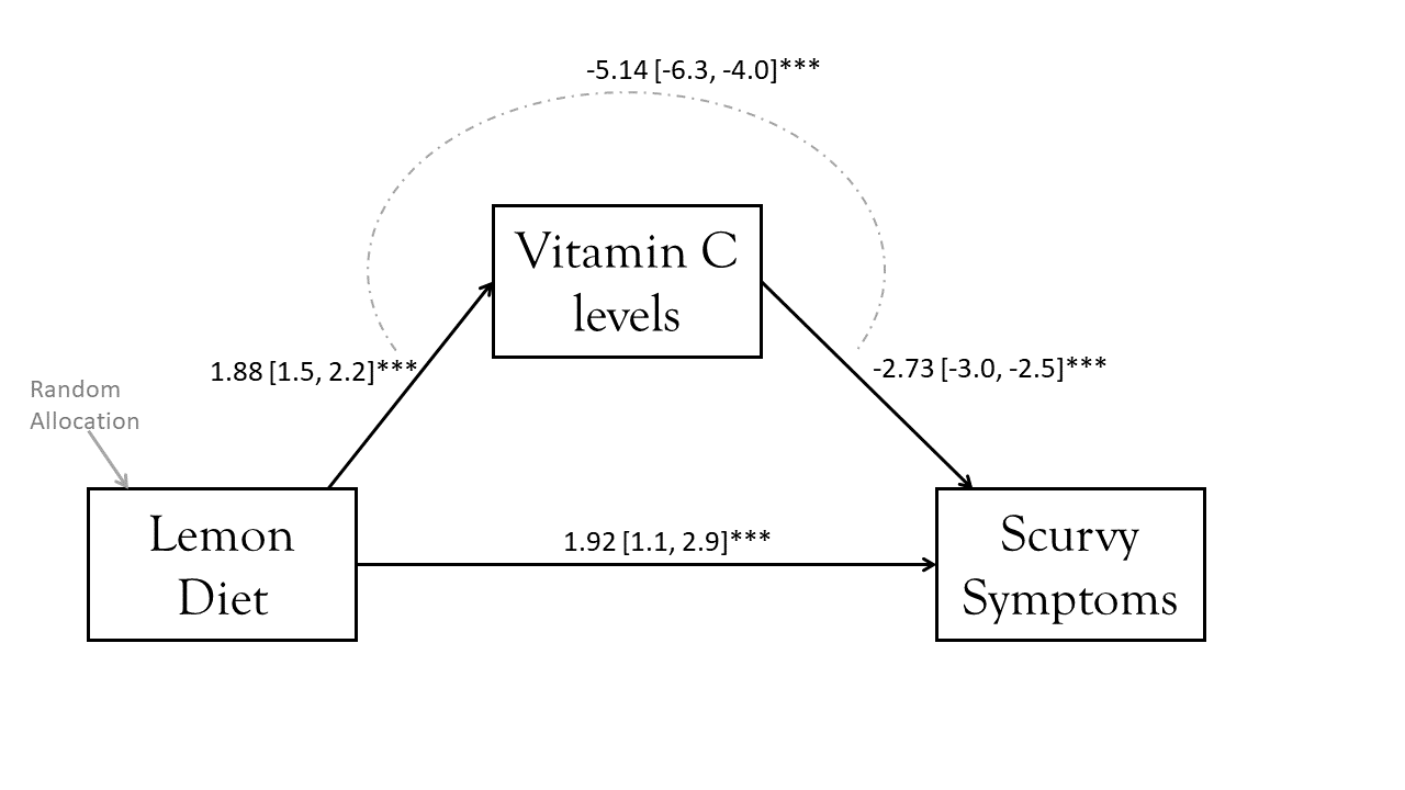 We can add these estimates to our diagram to present the model, as in the image below. Note that we do have a significant direct effect of the Lemon Diet on Scurvy — i.e., it looks like something about lemons other than their vitamin C seems to influence Scurvy (and it’s positive, so although the Lemon Diet has a total negative effect on Scurvy because of the effects of vitamin C, something else about lemons actually increases Scurvy?6).