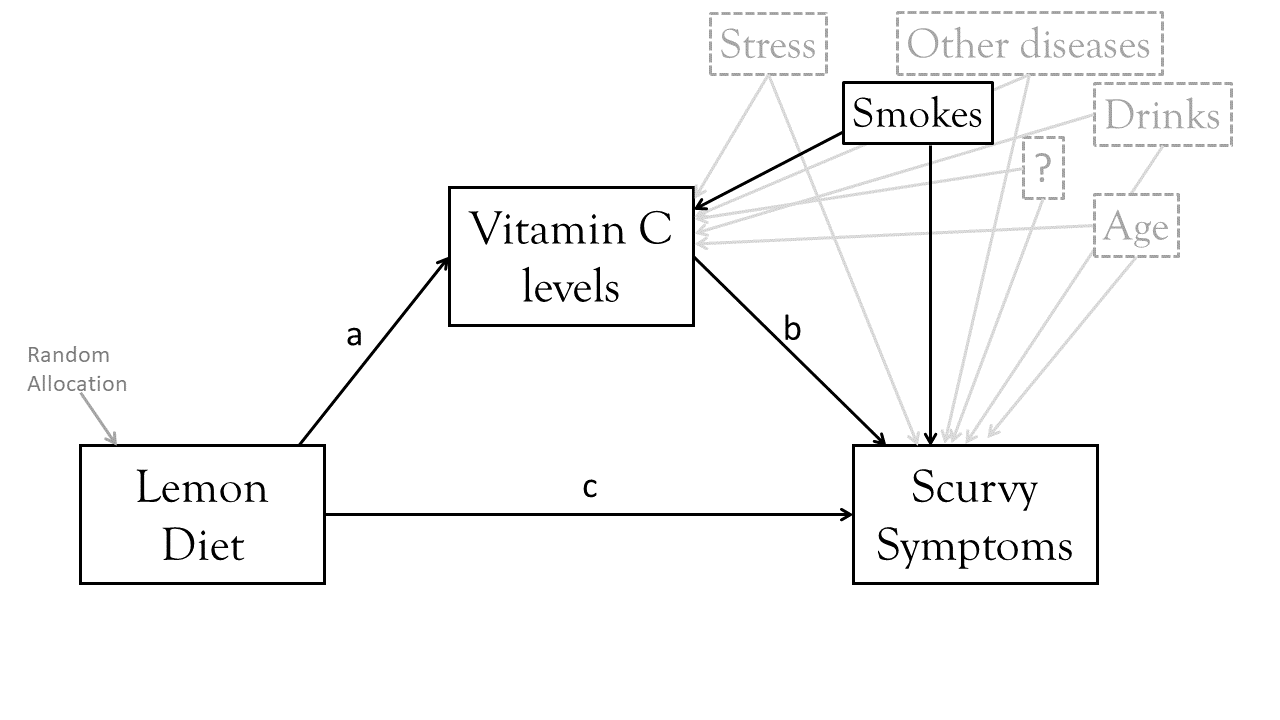 And look! Our indirect effect is much smaller, and the direct path from LemonDiet to ScurvySymptoms is no longer significant8. The problem that this opens up is that smoking is probably not the only confounder. There are probably loads and loads of things that we might not have thought of (e.g., Figure 8), and might not be able to measure very well. Which makes it very difficult to draw robust conclusions from mediation analyses.