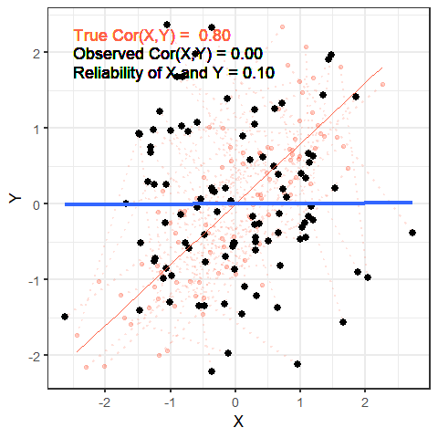 The animation below shows this idea. It shows two variables X and Y, that have a correlation of 0.8. This is the correlation we would observe if we could measure them perfectly. But we can never measure things perfectly! The more measurement error that we add, the more the correlation we observe goes towards zero. This will happens as measurement error increases on either variable (or both, as in the animation!)