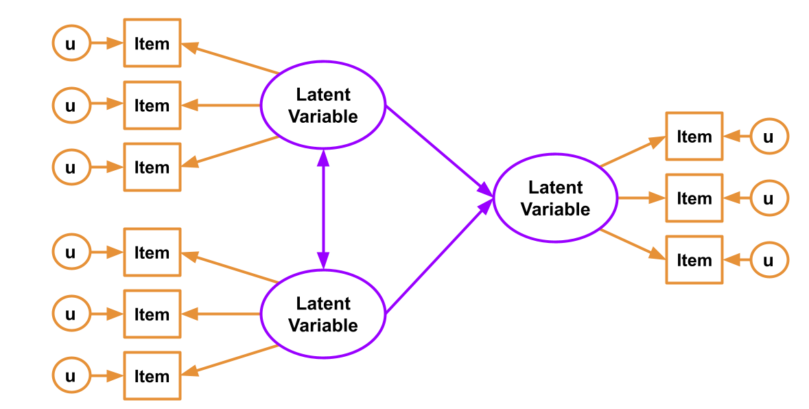 In SEM, we just combine these two parts! We have both a structural model and a measurement model. The measurement model is our specification between the items we directly observed, and the latent variables of which we consider these items to be manifestations. The structural model is our specified model of the relationships between the things we’re interested in (the latent variables, along with other variables that might f).