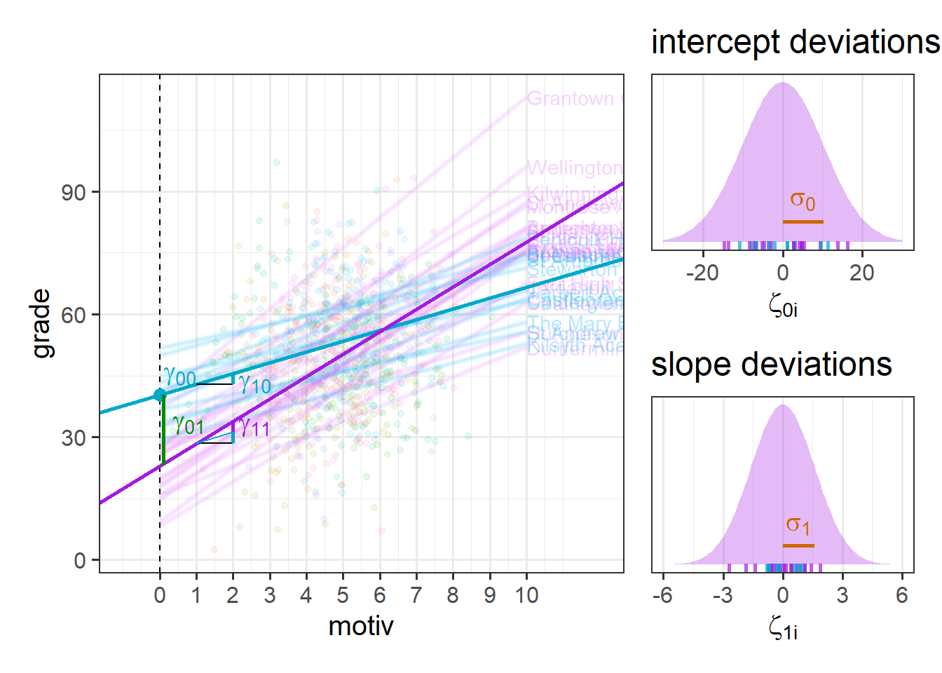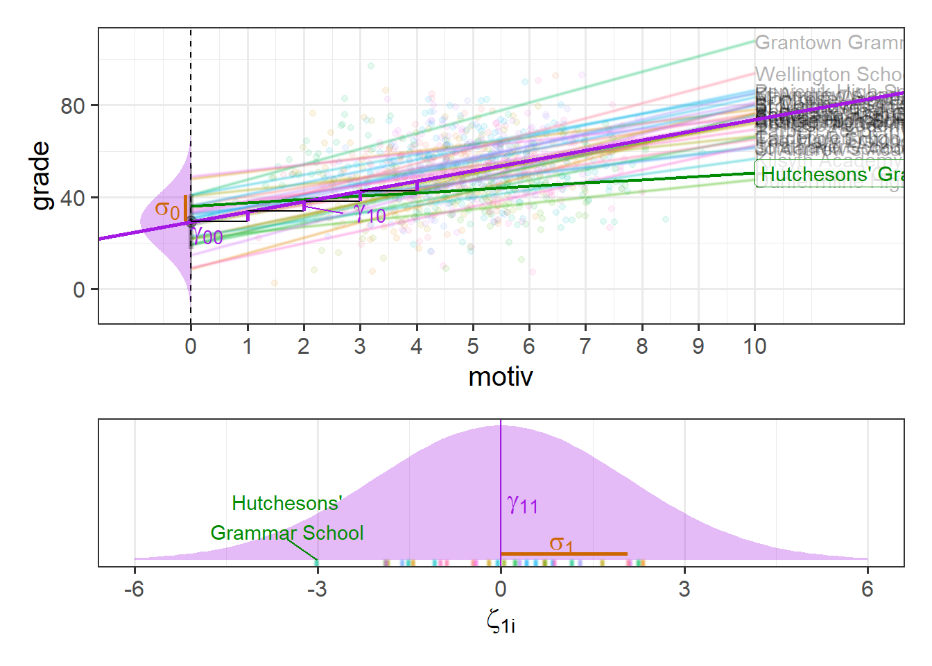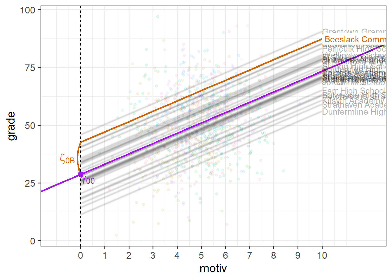 \[ \begin{align} \text{For Child }j\text{ in School }i& \\ \text{Level 1 (child):}& \\ \text{grade}_{ij} &= b_{0i} + b_1 \cdot \text{motiv}_{ij} + \epsilon_{ij} \\ \text{Level 2 (school):}& \\ b_{0i} &= \gamma_{00} + \zeta_{0i} \\ \end{align} \] If we consider one of our schools (e.g. “Beeslack Community High School”) we can see that our model predicts that this school has higher grades than most other schools (Figure 3). We can see how this is modelled as a deviation \(\zeta_{0\text{B}}\) (B for Beeslack) from some fixed value \(\gamma_{00}\).