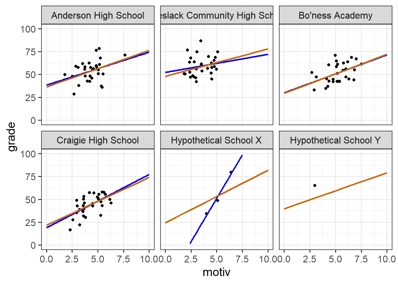 At this point, you might be wondering how this is any different from simply fitting clusters as an additional predictor in a single level regression (i.e. a clusters-as-fixed-effect approach of lm(grade ~ motiv + schoolid)), which would also estimate a difference for each cluster?