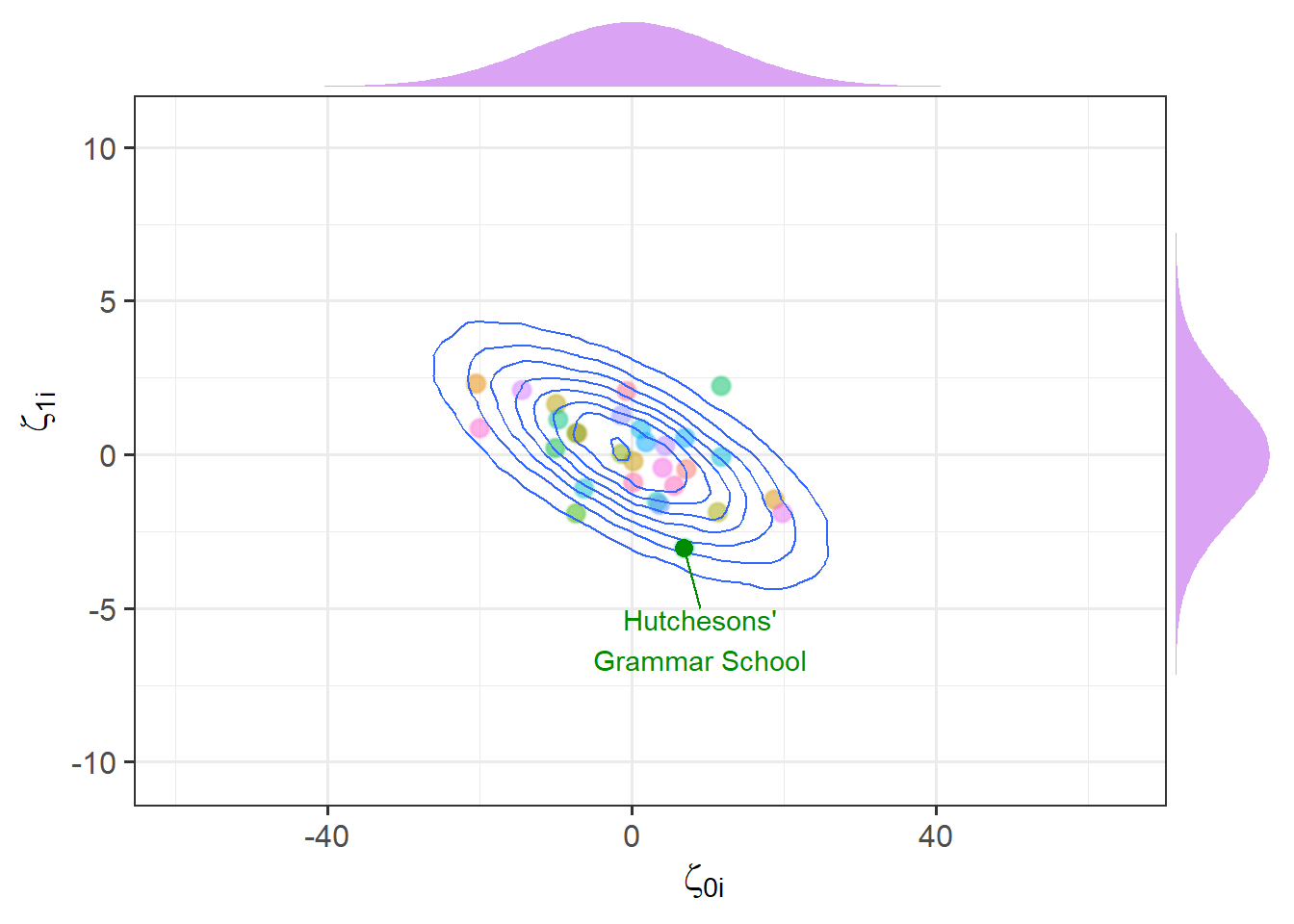\[ \begin{bmatrix} \zeta_{0i} \\ \zeta_{1i} \end{bmatrix} \sim N \left( \begin{bmatrix} 0 \\ 0 \end{bmatrix}, \begin{bmatrix} \sigma_0 & \rho \sigma_0 \sigma_1 \\ \rho \sigma_0 \sigma_1 & \sigma_1 \end{bmatrix} \right) \] For a visual intuition about this, see Figure 8, in which the x-axis is the intercept deviations, and the y-axis is the slope deviations. We can see that these are each distributed normally, but are negatively related (schools with higher intercepts tend to have slightly lower slopes).