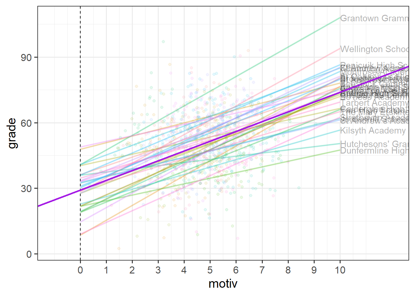 In Figure 5, we can see now that both the intercept and the slope of grades across motivation are varying by-school.