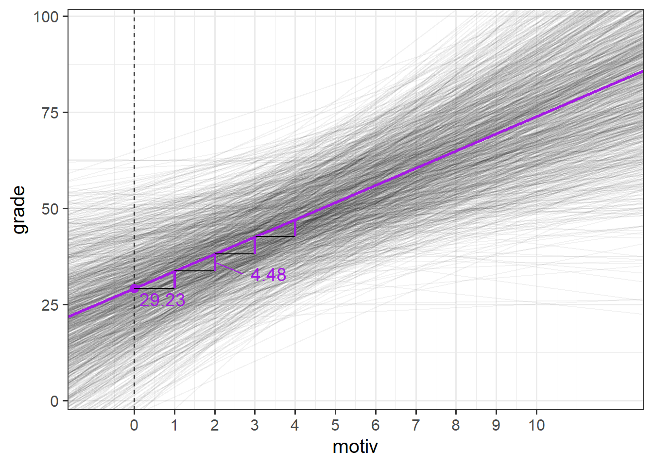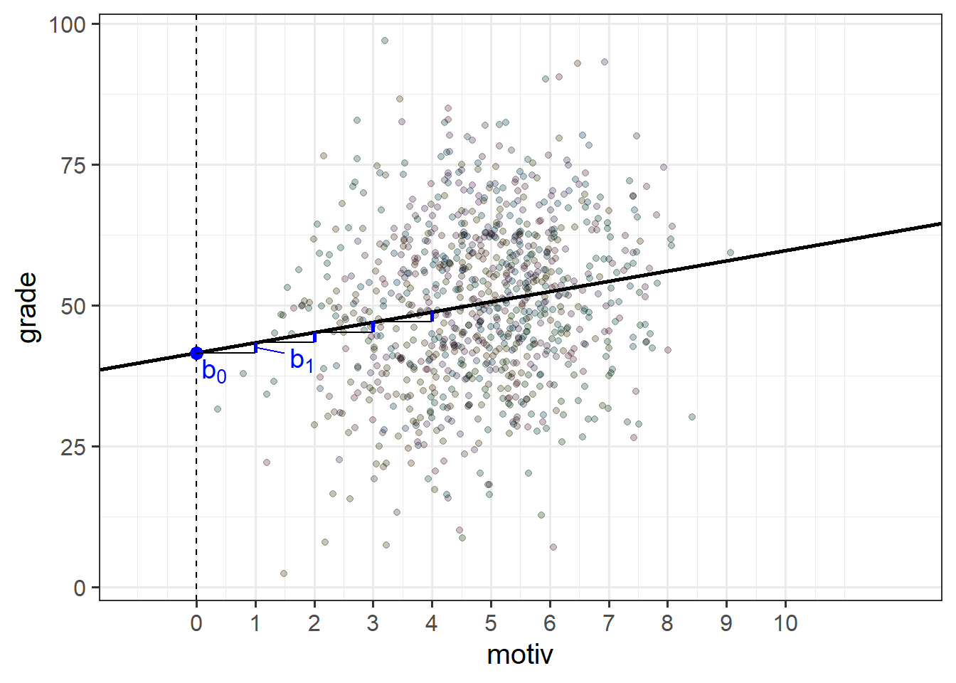 \[ \begin{align} &\text{For child }i \\ &\text{grade}_i = b_0 + b_1 \cdot \text{motiv}_i + \epsilon_i \end{align} \] i.e. For any child \(i\) that we choose, that child’s grade (\(\text{grade}_i\)) is some fixed number (\(b_0\)) plus some fixed amount (\(b_1\)) times that child’s motivation (\(\text{motiv}_i\)).